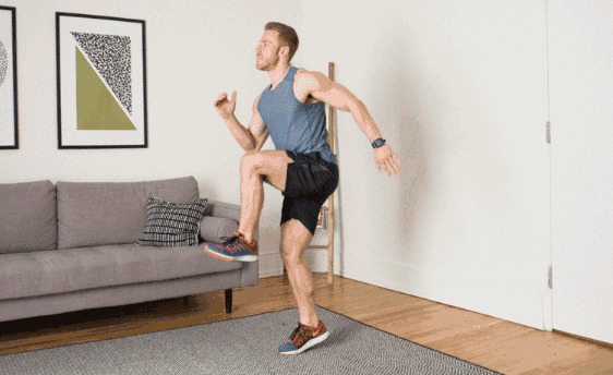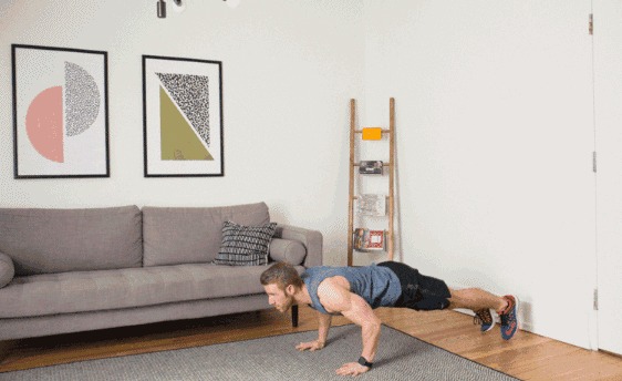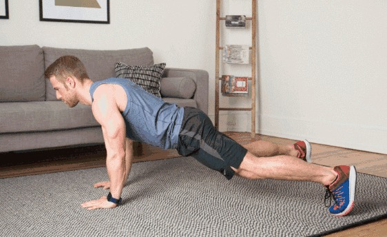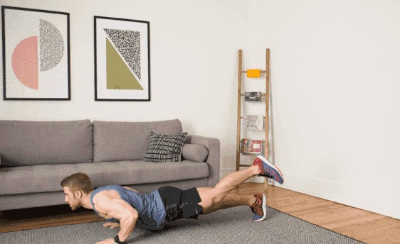 动作9 ▼ 双手、一只足尖撑地 一条腿向后悬空抬起 上肢向前攀爬后做一个俯卧撑 完成后后退起立,单膝跳跃。 动作10 ▼ 俯卧撑后起跳 并在最高处击掌,以此循环。 动作11 ▼ 以跪式起跑的方式单膝起跳 左右交替进行。 动作12 ▼ 双手抱头,深蹲跳跃 注意保持腰背挺直,落地时不要太重。 动作13 ▼ 做俯卧撑,起身时左右脚交替贴地攀爬。 动作14 ▼ 双手撑地,双脚蹬地 用上肢的力量让下半身悬空、落地。 动作15 ▼ 以箭步蹲的方式跳跃,左右交替。