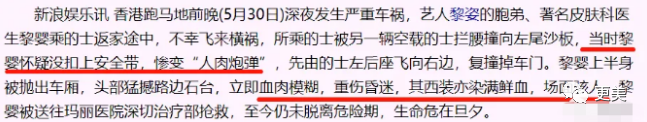 2007年5月30号,黎婴突遭车祸,头部受伤严重,血肉模糊,场面十分惨烈。