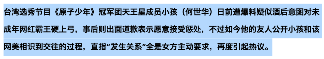 “火星”也出道了▽ (随便一截就一言难尽↓) 而开篇提到的“金星”▽ 虽然没出道,但各种组合巡演还是不少。 目前正在筹划出道…… 好家伙…… 这是选秀版的“一鲸落万物生”吧? 一部《原子少年》,为台娱至少输送了几十个爱豆…… 这是一季比赛抵内娱三季的意思吗 当然塌房也是在塌的▽ 成员们纷纷被爆出睡未成年少女↓ 还有各种欠钱不还↓