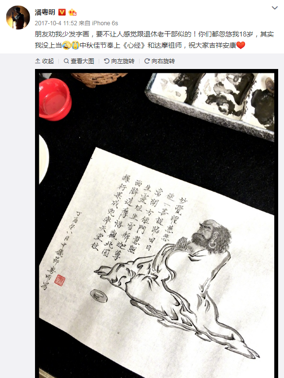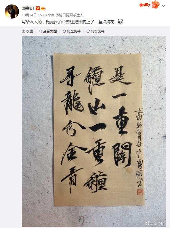 前两天,#潘粤明好瘦#突然间飚上了热搜。 2亿网友看完不敢相信:我去,竟然真瘦了!仿佛看到了当年的许仙! 清晰的锁骨和线条分明的脸部轮廓,让不少人重新get到了这位48岁大叔的颜值。 然而比起嗑颜,潘粤明这次上热搜的原因其实更令人惊讶。 因为这几年一直默默拍戏的他,最近一次上热搜是这样的:#潘粤明是鬼吹灯最忙幕后#。 不看剧的可能不知道这“最忙幕后”是何说法? 其实讲的是潘老师从《怒晴湘西》《龙岭迷窟》到《云南虫谷》《南海归墟》,不仅担任主演,还承包了片头题字。 除此之外,他也是片尾曲的作曲、作词兼主唱。 当大多数人已经开始提笔忘字,潘老师这些杂七杂八的技能,无疑是一股圈粉“逆流”。 而且仔细一扒,技能都有由来。 小时候,伙伴们都在院子里玩儿,就潘粤明被父亲按在屋里写字。 后来因为学业耽误了练习,他又沉迷于偷跑去小店听摇滚乐,对书法一直没上心。 直到2015年底受朋友的影响开始抄心经,他才重新捡起了写毛笔字的习惯。 结果一发不可收拾,连进组演戏都不耽误他练笔。 几乎每天写一张,慢慢地潘老师就写出了自己的风格。 更骚的是他因为发太多字字画画,被贴上过“微博日更画手达人”的标签。 可能因为从前没怎么关注,许多人都不知道潘粤明其实画画也不错。 2017年拍完《白夜追凶》之后,他开始学水墨画,现在随手作下的“消遣画”都很有灵性和趣味。 因为爱画熊猫,他还跟意大利品牌navigare出过联名周边。 网友们说他现在是“集演员、画家、歌手、设计师、书法家、摄影师于一身”的宝藏,殊不知他小时候也蛮牛。 潘粤明从小就开始学书法和绘画,并多次在比赛中获奖。 他中学被保送到北京市重点中学,期间做过学校记者站的记者,写过剧本,担任过北京电视台少儿节目《七色光》主持人; 还去剧组打杂,在几十部儿童剧中跑龙套,参演了经典老剧《三国演义》。 打完工顺便写的“拍后感”,也被发表到了报纸上: 然后一直到24岁进了演艺圈,出道没两年,潘粤明就因为跟袁泉搭档主演的《蓝色爱情》,提名金鸡奖和百花奖的最佳男主角。 4年后,他又凭借主演《京华烟云》《红衣坊》《白蛇传》三部大戏,成为当红小生。 时人见他,谁不称一句“丰神俊朗”“白面书生”,只可惜往后许多年间,他顶着这个称号,经历娶妻、生子、离婚风云,人气暴跌。 最惨的时候,潘粤明甚至找不到媒体合作,唯一被大众熟知的角色是《唐人街探案1》里的配角——油腻继父,一个变态杀人狂。 2016年,他因为会唱歌受邀参加《跨界歌王》时,节目组在屏幕上打的介绍语还是“文艺小生潘粤明”。仿佛十几年白过了,时间逝去而他什么都没有得到过。 到了节目第七期,他用红布蒙住眼睛,唱了一首李宗盛的《给自己的歌》,撕开伤疤剖析自己。 综艺播出之后,《白夜追凶》的制片人被那首《快让我在雪地上撒点野》的演唱击中,邀请他主演新剧,才有了我们之后吹爆的“一人饰四角”——哥哥、弟弟、哥哥假扮的弟弟、弟弟假扮的哥哥。 也是靠这部剧,潘粤明人气翻红,口碑暴涨,终于重新在演技圈有了自己的名字。 紧接着,“鬼吹灯系列”中评分最高的胡八一,也成为了无数粉丝心中最贴合原著的一版。 而他拼尽技艺,只说希望“一年为观众奉献一部好作品”。 翻滚半生,被误解,被诋毁,从高峰跌落低谷又爬起,褪去轻狂而归于平静的潘粤明,如今俨然是娱乐圈的“清流”。 大家看他开始练毛笔字,画水墨画,泡茶,偶尔吼吼摇滚,笑容逐渐憨化。 还有少不了的,每年都雷打不动地为分开的儿子庆生。 日常平平淡淡,只有偶尔的访谈能掏掏他的心里话: “我觉得人的一辈子,都是线性的,像心电图一样起起伏伏。 “娱乐圈,就像一个起起伏伏的大海。有的人是在快艇上,有的人是在皮筏子上,有的人可能只有一个救生圈,身上带的干粮也不多,但是大家都在努力。 “你擅长什么,你爱什么,你就尽量地去争取,往这个目标努力。 “每个人的机遇、境遇其实都不一样。我不知道我后面会遇到什么样的朋友,什么样的工作,但我都抱定一颗‘认真去干活’的心态就行了。不管多难,你只要克服它就好。” 看到这里时,D姐忽然间回想起了潘粤明瘦上热搜前发布的动态。 他刚跑完步,准备给友人送去一幅字,上面写着“寻龙分金看缠山 一重缠是一重关”。 知乎网友@豆子解释了一下它的大意,说的是:找宝贝你得看围墙,一重围墙等于一重关卡。 这是电影《寻龙诀》里出现的口诀,改编自典籍《撼龙经》。 但仔细一看,人生又何尝不是这样。 一山放过一山拦,也许是因为你离宝藏越来越近了吧。