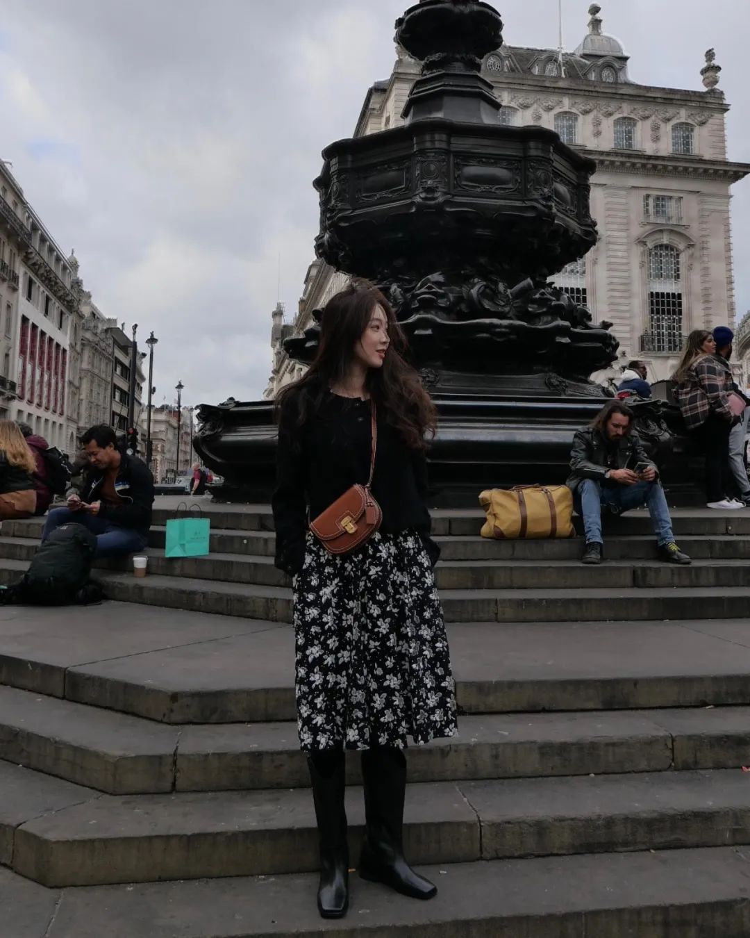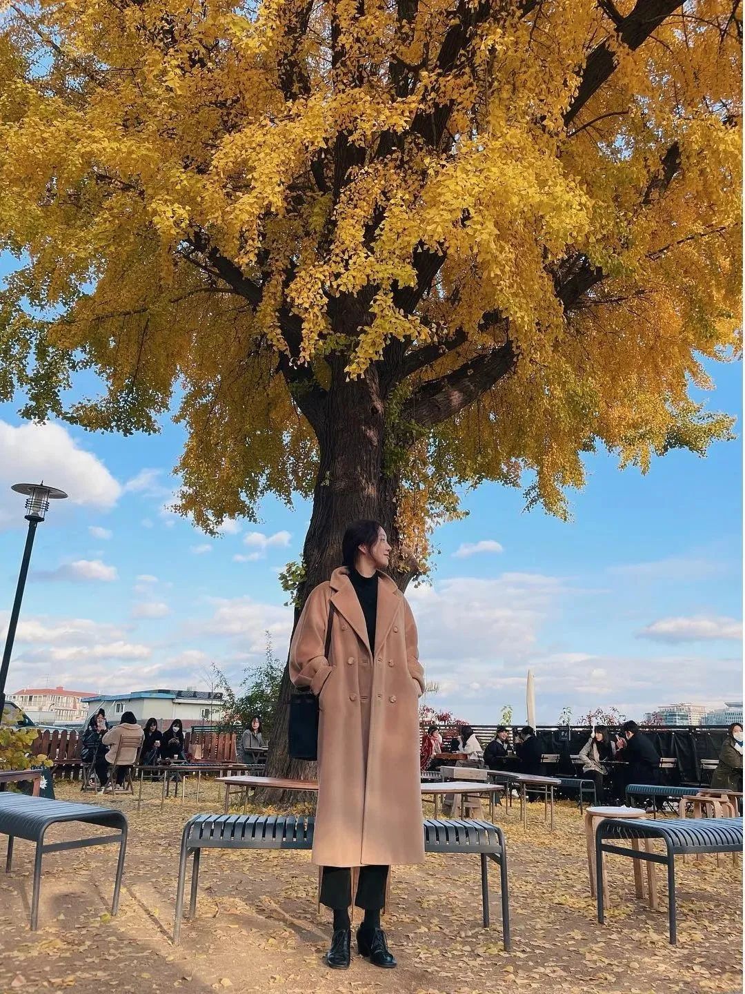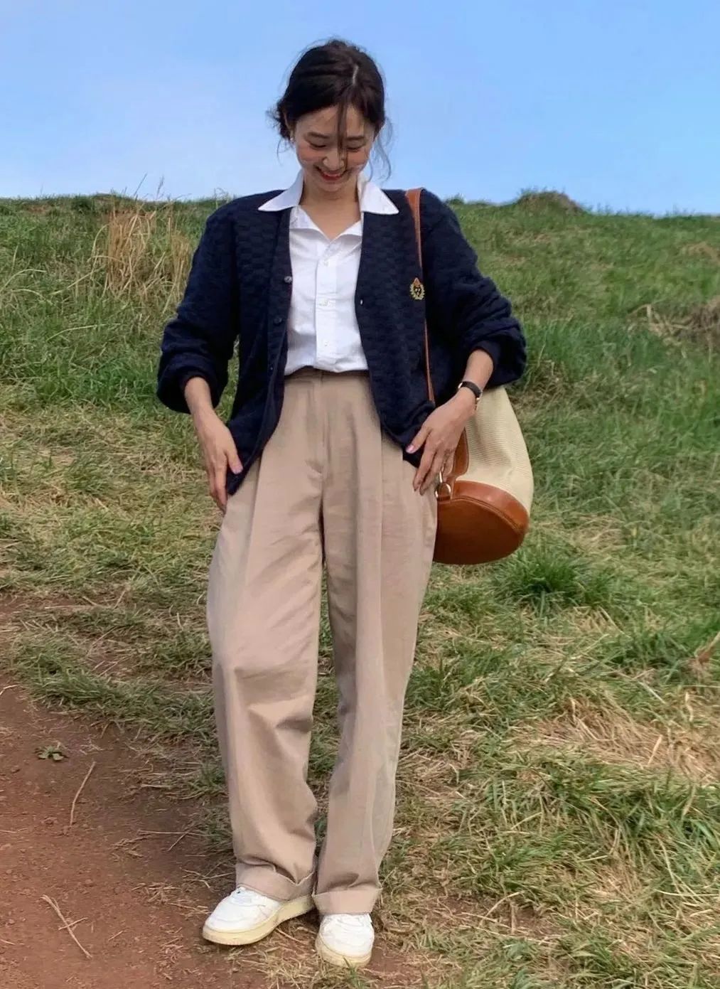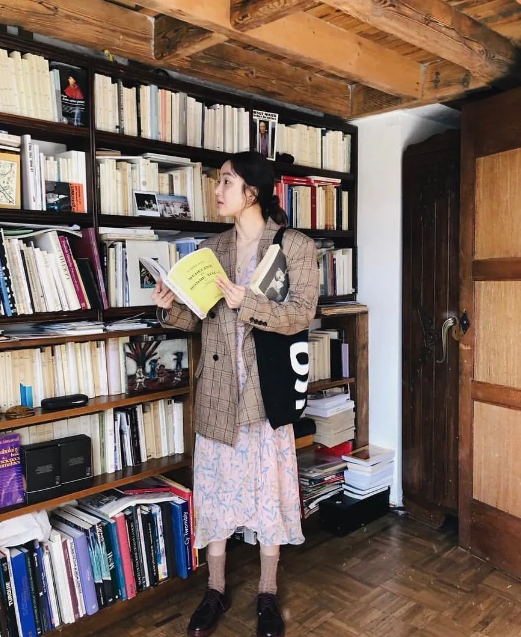 她经常背的帆布包都是竖版的,有黑白两个颜色,穿浅色的衣服背黑色,穿深色衣服就背白色,有大块图案装饰的不容易单调,几十块就能买到类似的款式。▼ 我们之前在写不同风格博主喜欢背的包时,提到很多走清新可爱路线的韩国博主都喜欢背各种小包。相反,想要减少可爱,增加清淡大方的氛围,可以试试背大包。 尤其是在秋冬,穿的衣服比较宽大厚实,背大包更容易有慵懒随性的感觉。 有小伙伴说之前get不到Longchamp的饺子包,看郑丽媛背又被种草了,一千出头就能入手。▼
