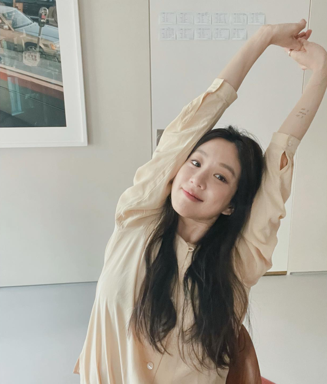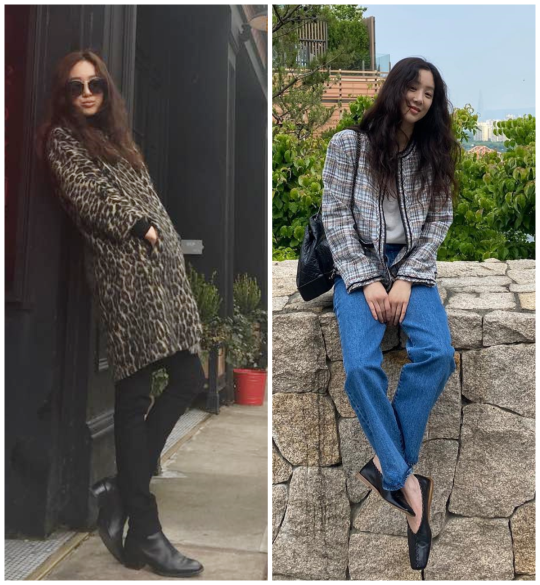 另一类是黑色和棕色皮鞋。穿短款外套,想帅气一点的时候会配牛津鞋、乐福鞋,穿裙子或者温柔的大衣风衣,会配稍微带点跟的鞋子,更优雅。▼ 经常“素面朝天”,分享随手拍生活照 前几天我发了很多郑丽媛的美图到群里,有小伙伴说:“很奇怪的是,她化了精致的妆,反倒没这么有辨识度了。” 左边这张说是别的韩国女明星大家也会信吧,但右边一看就是郑丽媛。▼ 她平时的穿搭和妆发,甚至照片风格都在“反·精致”。 她经常在ins上发自己的生活照,无论是在家,还是出去玩见朋友,很多时候都连口红都不涂,有种素面朝天的感觉。▼ 因为是淡颜系长相,她现在即便是化妆也非常清淡,没有很抢眼的颜色。▼ 大地色系眼影、裸色系口红,很像大家常说的伪素颜妆,相比早期的大烟熏妆有辨识度多了。▼ 发型也是氛围感的关键。 左边这种规整的卷发也是好看的,但相比于她平时有点凌乱的油画卷发型,少了那种松弛美。▼ 油画卷的卷度更随意,发尾也偏毛躁,在气质上跟郑丽媛这种淡颜系长相更配,更浪漫又不受约束。▼