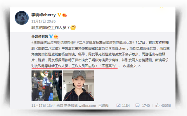 娱乐圈的故事果然比电视剧的剧本还要狗血,电视剧《爱的二八定律》好不好看不知道,但杨幂剧中的闺蜜扮演者李晓峰,在现实中居然是杨幂前夫刘恺威的新欢。 刘恺威和李晓峰的恋情被曝光后,在网络上不断发酵!有媒体专程致电询问李晓峰的工作人员,对方的答复:不是真的。 然而这条内容被当事人李晓峰转发,并附文:联系的哪位工作人员? 虽然李晓峰字里行间没有承认也没有否认,但言外之意还是很好理解的,意思是说媒体联系的工作人员不靠谱,也算是变相承认了与刘恺威的恋情。 而刘恺威方面也终于在11月19日,大方的公开承认了这段恋情,并表示:“多谢大家祝福,我们一切都很好,我们相处了一段日子,是好朋友介绍认识,我和她性格很合,相处的舒服、开心,关系很好,谢谢大家关心。” 杨幂当初为何要接这部剧?不尴尬吗? 刘恺威和李晓峰都是单身,男欢女爱倒也无可非议,但好巧不巧的是,在热播剧《爱的二八定律》中,杨幂和李晓峰在剧中的关系是好闺蜜,而且还有多场对手戏。 刘恺威李晓峰恋情未曝光之前倒也没什么,可如今恋情曝光且已经官宣恋情后,观众再看这部剧尤其是两人的戏份时,都替两人感觉到尴尬! 很多网友不禁开始追问:杨幂当初为何要接这部剧呢?或者说李晓峰当初接这部剧不觉得尴尬吗? 事实上,这部剧是在去年的2月份开机,距离现在都已经1年零8个多月了,也就是说,当初拍这部剧时,李晓峰和刘恺威的恋情还没开始。 此外,从该剧的宣传中也不难看出,李晓峰在这部剧中连女二号,甚至女三号都算不上。别说当初李晓峰与刘恺威还没有关系,就是有关系,杨幂作为该剧妥妥的女一号,也不至于推掉这部剧。 李晓峰也有婚史,且育有一子 刘恺威有婚史,这是众所周知的,而在此之前,很多人对李晓峰并不熟悉,不少网友误以为李晓峰是一位单身大龄女青年,而事实上,李晓峰也曾有过一段婚史,并且育有一子。 据了解,李晓峰的前夫是富商王翀,两人的婚姻持续了7年,然而最终没能逃过“七年之痒”的婚姻魔咒。 更有意思的是,李晓峰和王翀当时的媒人正是何炅,娱乐圈可真小!据说因为李晓峰的意外怀孕,两人在2010年选择闪婚,当初何炅、廖凡、汪小菲、姚笛等人都出现在婚礼现场。 婚后,王翀经常在个人社交账号秀恩爱晒幸福,这种幸福终于在2017年悄无声息的戛然而止。