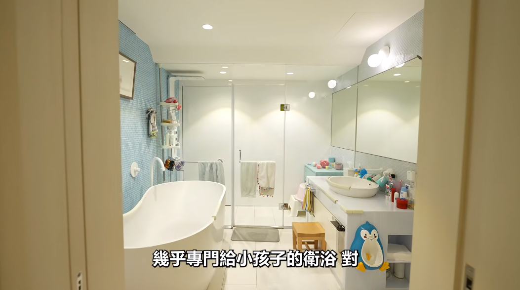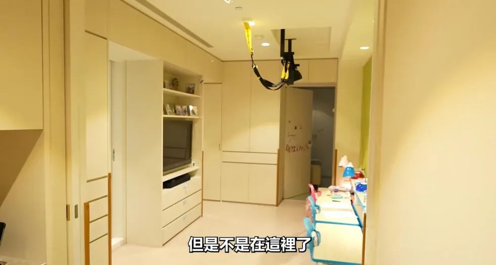 儿童房内有个独立的卫生间,因为第一次怀孕的时候,不知道会生男孩还是女孩,便选择了中性的蓝色马赛克瓷砖。 搭配四面白墙,干净清爽。 豪横的主卧大套房 孩子们的年龄小,卧室暂时只有睡觉的需求,布置得便比较简单,但大人就不一样了。 关颖和她先生的主卧,是一个“豪横”的大套房。 推开房门,先看到的是一个迷你茶水间,若是晚上口渴想喝水,不必“跋山涉水”跑去厨房。 茶水间右侧的移门内,是关颖先生的书房。 这里整个家中颜色最深沉的空间,从地板到墙面天花板都是深木色,大气沉稳。 这个角度,可以透过鱼缸看到客厅的景象。 打开茶水间左侧的门,才算正式进入主卧。 这里面积很大,关颖先生的衣帽间的尽头,是他的健身区。