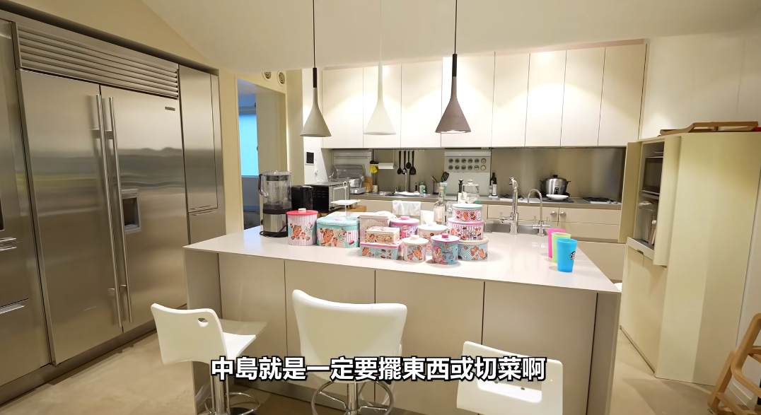 厨房内部有个超大的中岛,不锈钢材质的系统收纳柜、白色橱柜和小型储物柜,都围绕着它而设置,形成方便的洄游动线。