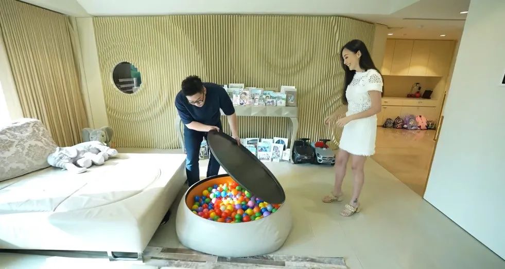 最左侧的圆玻璃内是个鱼缸,强调着墙面的「流动感」。 透过这个鱼缸,还能看到关颖先生的书房。 为了舒适感和安全性,沙发下方铺设了柔软的地毯,关颖和她的先生可以经常带着孩子们,在这里活动。 茶几摆放在沙发卧榻一侧,打开盖子后是满满的彩色海洋球,孩子们小的时候可以在里面玩耍。
