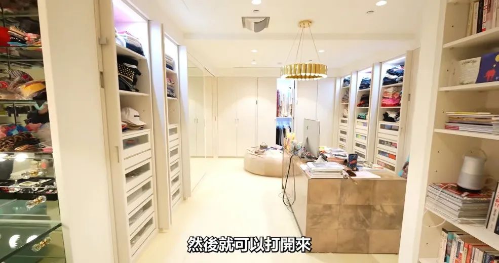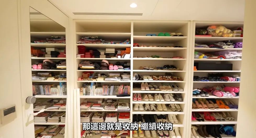 对了,她家里还有个客卫。 它的面积虽然小,但布置却毫不马虎,一体成型的木纹墙贴纸铺设在不规则墙面上,搭配同样不规则的天花、浴室镜和置物台,有趣极了。 压轴出场的“夸张书房” 关颖的书房,是作为压轴嘉宾出场的,因为这里实在太太太太令人羡慕了。 这里拥有办公与衣帽间的全部功能, 四周全部是开放式或封闭式的大型储物柜。 常看的书籍、三个孩子和关颖的鞋子,放在开放式的柜子里,一目了然方便寻找。