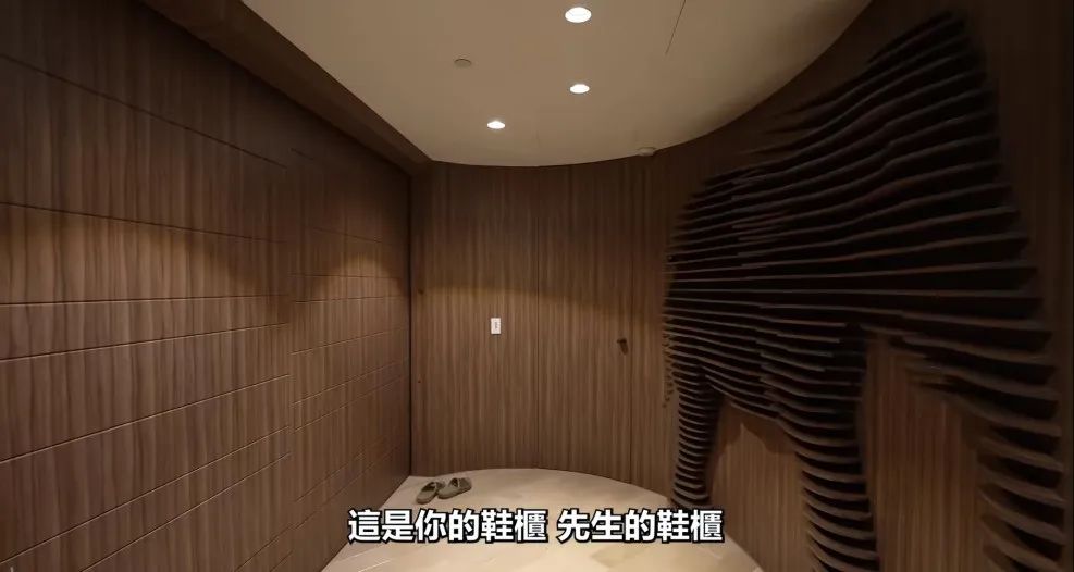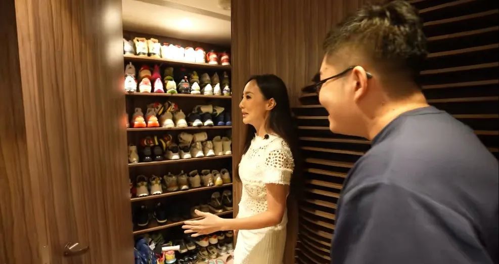 内玄关的墙面铺设深木色的木饰面板,搭配白色吊顶与浅木色地面,大气优雅、没有丝毫沉重之感。 推开靠近大象图腾尾部的隐形门,是关颖先生的鞋室。 内部采用开放式收纳架,将他所有的鞋子摆放得整整齐齐、一目了然。