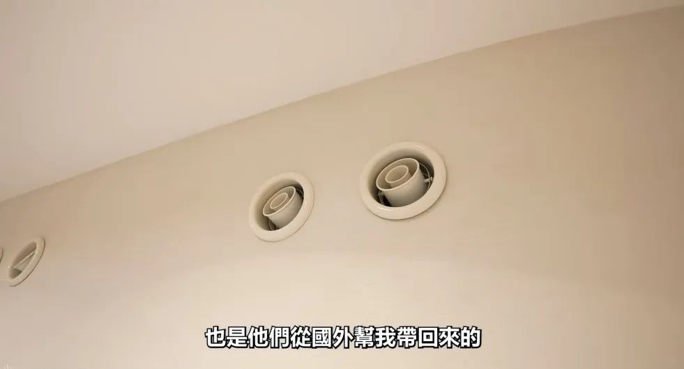 睡眠区域布置的比较简单,床头采用大地色的软包,营造出沉静的睡眠氛围。 双人床右侧,还有个小小的休憩区,舒适感更高了。 主卫的面积也很夸张,不仅摆下了足以容纳两个大人的浴缸,还设置了双台盆,关颖和她的先生一人一个。