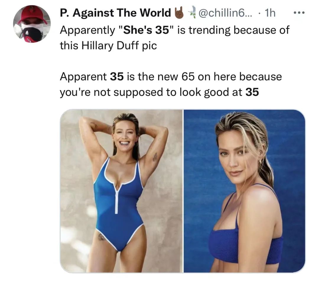35岁的她招谁惹谁了?? 今天一早,美国女演员希拉里·达夫(Hilary Duff)上了推特热搜, 女明星上热搜倒是太常见了,但这回她上热搜的原因却是很令人费解: “希拉里·达夫35岁了,依然看起来很棒!!” 依然……?难道35岁看起来很棒很奇怪吗? 她是...35?说她“仍然看起来很棒”是什么意思呢???? 她当然看起来很棒...她35岁啊。 她才35岁又不是85...不然你想让她长成啥样? “她35岁了”上了热搜是因为希拉里·达夫的这张照片。显然35岁在这儿已经成了65岁了,因为在这个年纪,人们认为你本不该状态这么好的。 麻辣鸡40岁看起来状态更好 希拉里·达夫,一个迪士尼童星出道的美国知名女演员,三个孩子的妈妈,上了热搜,只因为人们不相信“她35岁了,但依然看起来不错”??? 这个莫名其妙的热搜还得从希拉里·达夫最近的一次采访说起。 1987年出生于美国休斯顿的她,今年35岁。十岁那年,她就在电影《鬼马小精灵3》中获得了第一个重要角色,从此她就一直是聚光灯的焦点。 后来,希拉里·达夫又主演了迪士尼的儿童剧《新成长的烦恼》,成了与傻脸娜Selena Gomez、麦粒Miley Cyrus等一样的迪士尼童星。 此外,她还出演了《灰姑娘的玻璃手机》、《拜金女郎》、《老妈老爸的浪漫史》等多部作品。 除了影视表演之外,她还发行了音乐专辑,拥有了自己的时装公司和香水品牌。 在感情生活中,希拉里·达夫最出名的一段感情,大概就是和同样童星出身、上个月被发现溺死在家中的浴缸里的亚伦·卡特了吧。 两人当年也是红极一时的情侣,不过分分合合三年后,最终也没走到最后。 在这次采访中回顾,希拉里·达夫就回顾当时自己年少成名的经历时,还讲述了一段艰难的时光——她在青少年时候过一种可怕的饮食障碍。 “我站在镜头前,而女演员们都非常瘦”。 达夫透露,她在17岁时,体重只有98磅(约90斤),而过轻的体重也给她的健康带来不良的影响,“因为得不到充足的营养,我的手也会经常抽筋”。 不过好在,她已经走了出来,与自己的身体和解,接受并爱上了自己现在的状态。 希拉里·达夫后来经历了结婚、离婚、再结婚,先后生育了一儿两女,现在和老公、创作歌手Matthew Koma,以及可爱的孩子们过着幸福的生活。 随便翻翻她的ins,上面全部是一家人幸福生活的痕迹。 正是有了这样的经历,她才晒出自己35岁的照片告诉大家要珍惜健康,与自己的身材和解,万万没想到转头又被自己这个35岁的年龄绑架了...... 拜托,她才35岁,当然看起来很棒,不然呢? |