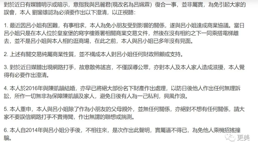 2023年1月3日,也就是两天前。 71岁十分惜命的刘銮雄,拖着病体,哪怕顶着口罩的压力,也要召开记者发布会👀 因为分手8年的前女友吕丽君骗他见面,还雇狗仔拍照发报、拍视频满网传,说他俩要复合、甘比地位不稳,更是疑似准备抢财产。 大刘在发布会上连爆猛料,说某个娱乐圈女明星,结婚都两三年了,还找他买包买钻石👀 还特地声明,塞关之琳春卷/高尔夫/乒乓球的不是他。 大刘在这次发布会上,一边爆着一个又一个的大瓜,一边情绪很是激动。 直言他的前女友没一个好人,特别是混娱乐圈的。 洪欣:“???” 蔡少芬:“???” 关之琳:“???” 袁洁莹:“???” 李嘉欣:“???” 好家伙,虽然是吕丽君扯出的风波,但一堆人躺枪。 难不成眼瞅着就要过年了,刘銮雄一口气帮香港娱记超额完成全年kpi,让大家伙过个好年! 风流的香港大鳄 刘銮雄大家都知道吧,有名有钱且风流的香港大鳄,二十多岁就有上亿身家,现在身价到了135亿美元。 在港圈神仙打架的巅峰时期,他包 养过一众金丝雀,蔡少芬、关之琳、洪欣等一众香江美人都和他有关系。 特别是李嘉欣,曾经受到过独宠。 吕丽君则是刘銮雄前女友。 有着伦敦大学博士的高学历,还参选过港姐。 △中:吕丽君 这次俩人见面被拍的事也是很抓马。 前几天,刘銮雄到自家的商场逛街,他看到一个男的坐在商场大厅柱子旁边,刘銮雄觉得他妨碍行人,就让他离开。 男的说自己累了、在休息,要刘銮雄绕过去,刘銮雄很生气,两人就吵起来。 吕丽君就站在在一旁看着,正好被拍到,没多久这件事就人尽皆知。 甚至传闻他俩要复合,甘比将出局。 不过港圈的瓜虽然好吃,但确实太久了。 所长先带大家回顾一下。 讲道理,按吕丽君的颜值来看,虽然不差,但肯定和明星没法比。 参加港姐也落选了,还有了个“落选港姐”的名号(吕丽君:听我说,谢谢你😊) 但她在国外留过学,让大刘觉得带出去有面子。 这才让当时还是柜姐的吕丽君,从她白富美好闺蜜(兼顾客)的王颖妤手里,硬生生抢走刘銮雄。 △左:王颖妤;右:吕丽君 刘銮雄和吕丽君公开恋情后没多久,吕丽君就怀孕了,让51岁的刘銮雄时隔20年再度当爹,老来得女,至今都惦念这个女儿。 不仅送给吕丽君价值3亿的房产和珠宝,同时,吕丽君还被允许搬到香港刘宅居住。 当时的吕丽君整个人都春风得意,并开始以“刘太”自居。 她以为地位稳了,却没想到横空杀出个甘比。 甘比家很穷,她做过娱乐记者,天天追着明星写八卦,当时香港的明星富豪圈子眼里,狗仔是很让人烦的群体。 但甘比就是能凭自己的本事,和很多明星成为朋友,不论多难缠的人、多隐秘的绯闻恋情,她都能顺利拿到独家报道。 每当刘銮雄有活动,都是由她采访,后来一来二去,刘銮雄看中她的能力,于是挖她到自己的公司工作。 后来甘比升级成为刘銮雄的贴身助手,从这时候开始,她开始常伴刘銮雄的左右。 就颜值来说,当时的甘比,是比不上吕丽君的,所以吕丽君本来没把甘比放在眼里。 但过了一段时间,甘比也生下一个女儿,刘銮雄再次老来得女。 于是大手一挥,给甘比奖励了多达3亿元的物业,还给出生不久的女儿买了价值几千万的珠宝。 这下子可点燃了吕丽君的炸药桶,她直接给媒体发传真,说甘比孩子不是刘銮雄的。 她以为抹黑甘比是巩固自己的地位,其实这相当于当着所有人面,给大刘戴了个大绿帽。 后来连刘銮雄母亲都亲自下场打脸,自证孙女血脉。 这一局,吕丽君也是把自己梦想中的婆婆彻底得罪了。 气归气,吕丽君还是决定奋力一搏,又生下一个男孩,想要母凭子贵,但大刘的妈妈就是不同意。 △中左:吕丽君;中右:甘比 大刘母亲认为,凭她跟吕丽君的接触,以及从八卦新闻上看到的,她觉得吕丽君并不是一个安分的人。 每次吕丽君上街,犹如太后出巡,身边围绕着一群保镖,把她护在中间。 就连开着车行驶在路上,四周也有保镖围着,这样高调的大排场,让大刘母亲很不喜欢,觉得太张扬。 在她的心里,穷苦出生的甘比就比吕丽君朴实的多。 确实,甘比的性格与吕丽君差别很大,她很会讨好刘銮雄母亲,也很会伏低做小。 有名的“肉垫事件”,就是甘比和刘銮雄出门吃饭,下台阶时刘銮雄差点一脚踩空,甘比毫不犹豫挡在刘銮雄身前,给他充当人肉垫。 这件事可给刘銮雄感动坏了,而甘比对自己越狠,在刘銮雄心里地位也就越稳。 哪成想,又过了没几年,风流一世的刘銮雄,肾衰竭了。 甘比此时更加发挥自己伏低做小的优势,在医院照顾刘銮雄,而吕丽君则是直接打电话给刘銮雄律师,天天问刘銮雄死没死。 刘銮雄哪受得了这种对待,于是和吕丽君say goodbye,甘比又赢了一局。 不过刘銮雄也不是说和甘比在一起就收心,毕竟甘比生了两个孩子后,刘銮雄也没和她结婚。 但刘銮雄偏偏在花3亿换 肾后,不光送甘比180亿港币,还给她了400亿股份,甚至和甘比领了结婚证。 所以坊间才传闻那颗肾是甘比妈的,毕竟这前后转变也过于大了。 鳄鱼的眼泪 话说回来,看到这里,也不怪港媒爆新闻老是拿刘銮雄开刀。 实在是刘銮雄自己帮自己揽了太多料,才让这次澄清费了90分钟。 刘銮雄发布会上首先说的,就是对现任太太甘比陈凯韵一往情深。 他反复否认与吕丽君复合,强调当天见面只是在签合同,不是复合,而是因为孩子见面的。 还说和吕丽君分手后,这8年来从不相往来,这次明显就是被骗了。 问到对吕丽君为人的评价,他说“不方便评