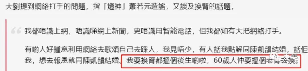 而这次澄清,刘銮雄谁都说了,唯独对原配三缄其口。 难怪有人这样评价刘銮雄: “老了,哪都是软的,只有心是硬的。” |