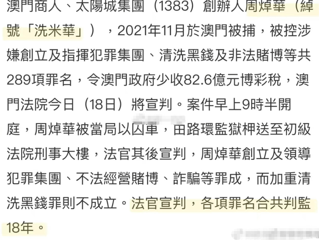 近日,有“澳门新赌王”之称的周焯华,外号“洗米华”被判刑18年,这桩历时超1年的案件终于迎来了结果,不过还是有网友觉得,18年还是判轻了。 根据媒体报道,洗米华被控创立和控制犯罪集团,不法经营赌博,诈骗和洗清黑钱等289项控罪,涉案金额高达8000亿港币,也就是6800亿人民币,这个数目是很多人几辈子都赚不到的金额。 在审理过程中,洗米华曾否认控罪,他的妻子洗米嫂和长子都曾经到法庭现场支持洗米华。 不过每个人都应该为自己做过的事情负责,这次的判决结果是,洗米华被判刑18年,同时还需要赔付给澳门政府以及几家博彩公司共计超86亿元,其中两间公司的老板分别是何超琼和霍震霆。洗米华事后表示没有什么话想说的,只是觉得很无奈。 今年已经48岁的洗米华,如果按照18年的刑期来算,出狱的时候已经66岁了,曾经的“赌王”和“娱乐大亨”,也变成了老人家。虽然如此,但不少网友还是觉得18年对于洗米华来说还是判轻了,因为洗米华涉控的罪名和金额都令人咋舌。 不管怎么样,洗米华也算是受到了惩罚。在这次事件之前,洗米华最大的争议还是关于他的妻子洗米嫂和情人刘碧丽之间的“夺米大战”,当年“二女争夫”的故事一度是媒体的关注点。 身家百亿的洗米华有着一位一起白手起家的妻子周慧玲,人称“洗米嫂”,但洗米华后来又认识了“玉兰油女神”刘碧丽,人前人后毫不掩饰两人的关系,刘碧丽也以洗米华“情人”的身份一直活跃着,帮洗米华5年生了三个孩子。 直到2019年,洗米嫂以离婚相逼,洗米华权衡之下答应和刘碧丽分手,媒体曝洗米华给了刘碧丽3亿分手费,但加上房产和其他资产,分手费其实高达5亿。 洗米嫂本来以为终于赶走了刘碧丽,但没想到2020年,有媒体拍到洗米华和刘碧丽带着孩子在泰国旅游。 但令人意想不到的是,没多久刘碧丽带着孩子们定居国外,并且公开宣布已经和洗米华分手了,还透露自己为洗米华生了第4个孩子。 之后刘碧丽还真的和洗米华没有联系了,但洗米嫂并没有安心太久,不久后就发生了洗米华被批捕的事件。洗米华被批捕之后,传闻洗米嫂“卖房救夫”,而这次洗米华被判刑和需要赔付86亿,不知道洗米嫂会否受到影响。 反倒是已经和洗米华分手的刘碧丽,在拿到了5亿分手费之后,刘碧丽在国外买了价值2亿多的农场,在自家农场上种有机物,专心经营农场之余还成为了专栏作家,生活简单滋润。 和洗米华分手之后,刘碧丽偶尔会分享近况,才37岁的她已经青春不在,不但身材发福皱纹也很明显,但手握几亿身家的她,足于让自己和4个孩子过上不愁吃穿的生活了。