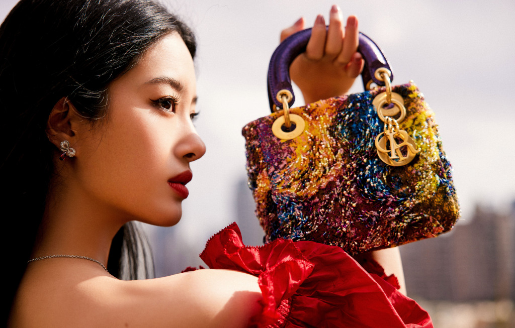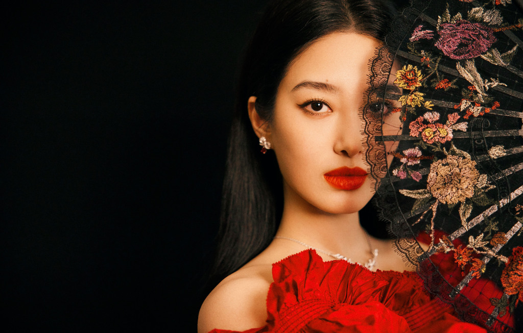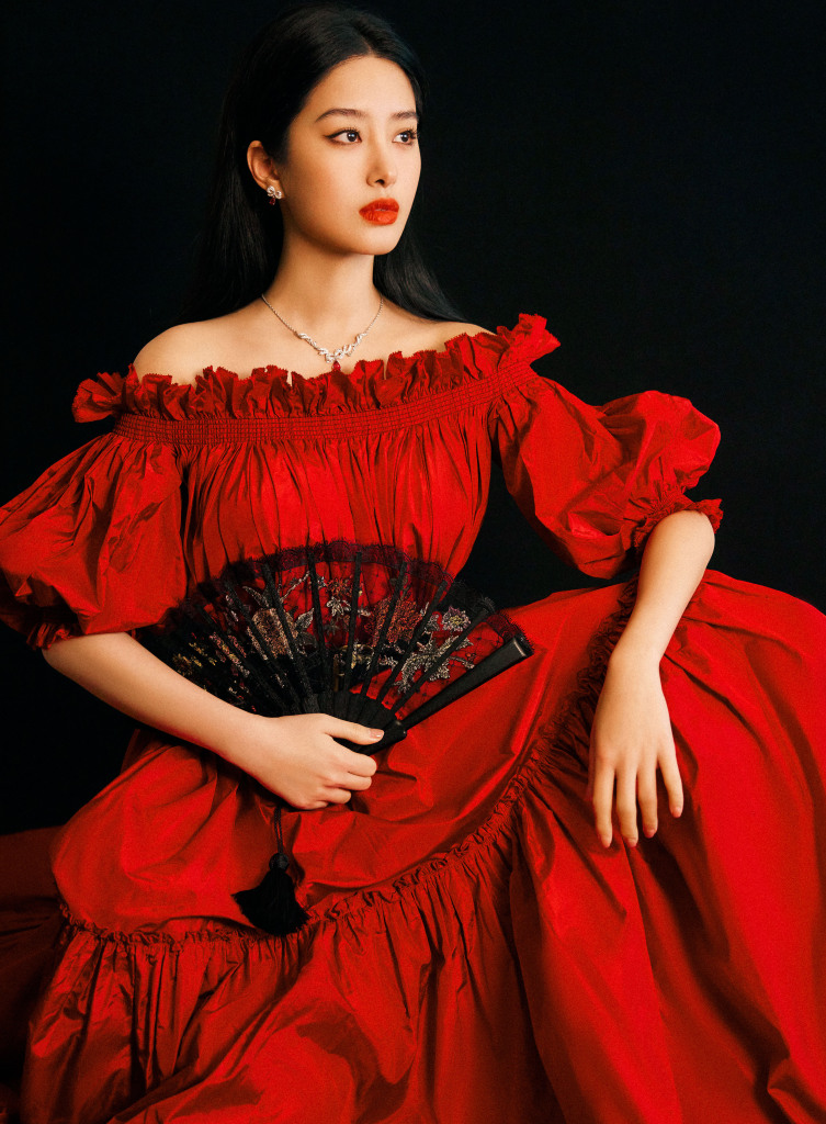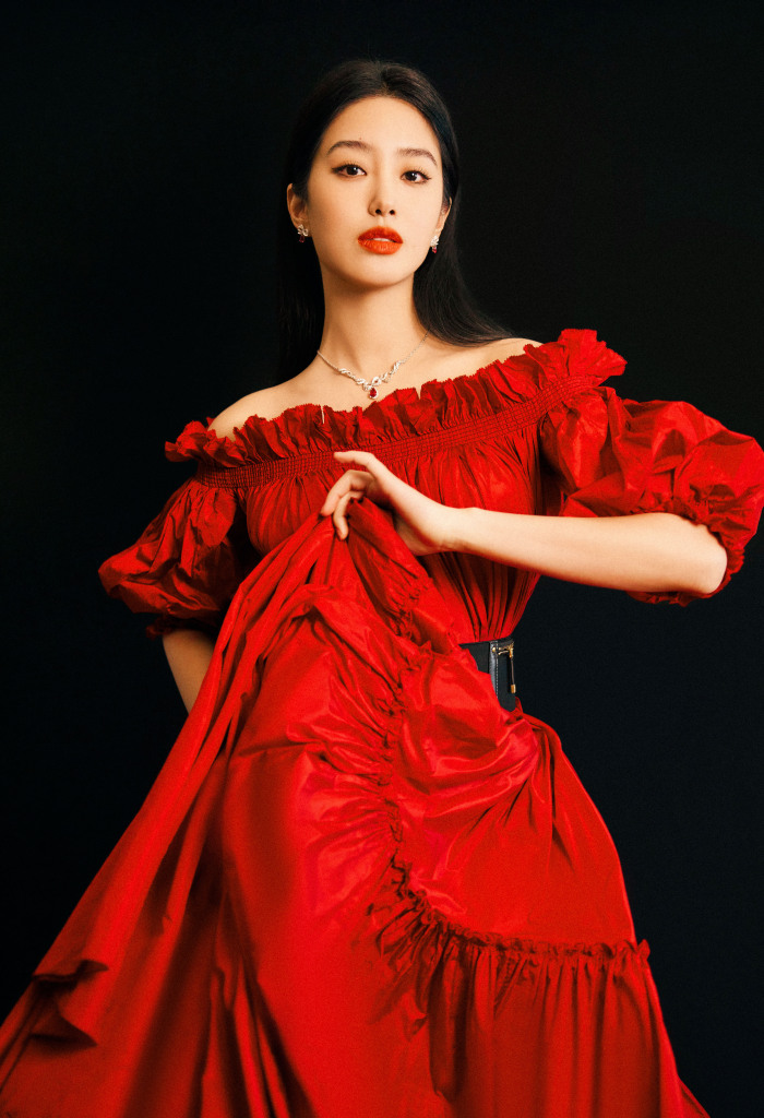 2022年11月10日,杨采钰出席Dior上海艺术展,拍摄烈焰红裙造型写真。