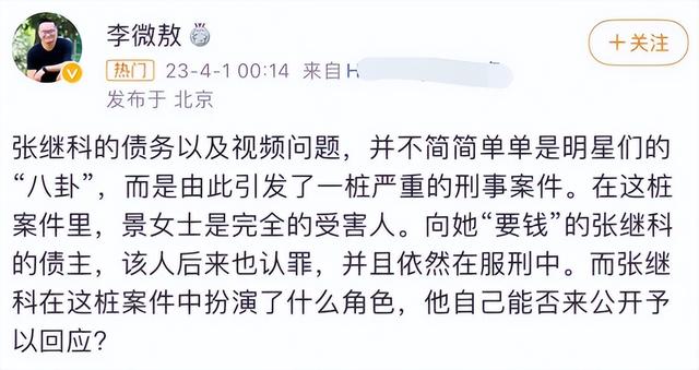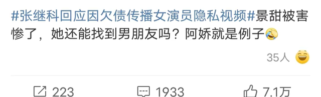 这几天,景甜以往的采访被不断翻出来,甚至就连《司藤》里的对白都无数次刷屏。 剧中的情节是,景甜饰演的女主角司藤,像是在自说自话,又像是在问男主角秦放:“你说一个女人,明知道一个男人在骗她,还要跟他在一起,是为什么呀?” 男主有点不知所措,回答说可能是因为爱吧? 女主笑了,似乎在笑男主角的看法太肤浅,又似乎在嘲笑自己曾经多么可悲。 她自顾自回答说“是因为蠢吧。” 是爱还是蠢,司藤知道,景甜也知道。 这段时间,张继科一个又一个话题词被顶到热一:#张继科不愿意处在风口浪尖上。 可是不知他没有想过,因为他,景甜这几天一直处于风口浪尖上。 某记者爆料,张继科因为欠了巨额赌债,将自己和前女友景女士的私密视频抵押给债主S先生。 消息传出来,所有人第一时间猜到景女士就是景甜。 首先是因为娱乐圈里姓景的女明星并不多,其次景甜和张继科曾经官宣恋情,分手也还上了热搜。 一开始很多人对于这个爆料还是将信将疑,接着张继科工作室两次发了声明辟谣,还表示要起诉造谣者。 接着爆料人不仅放出了张继科的借款合同,还爆料债主S先生拿着张继科给他的三段私密视频,找景甜索要2200万。 因为敲诈勒索, S先生喜提7年牢饭。 很多人这才回想起来,景甜曾经的采访。 据景甜自己所说,那段时间的她,处于人生最黑暗的时候。 每天不想出门,连房间都不想出,她觉得自己像漂浮在一望无际的大海上,每天都在往下沉。 如此绝望的时候,却没有人给她扔一个救生圈,没有人来拉她一把。 想必景甜说的至暗时刻,正是被S先生敲诈勒索的那一段时间。 没有人知道景甜经历了怎样的灰暗时期,可以想见的是,恋爱分手,悲伤难过自不必说。 得知对方拿自己的私密视频去抵债,还被第三个人看到,拿来敲诈勒索。 失望后悔,人性无底线的恶,她应该是什么样的复杂心情都有。 爆料加上采访,一切都对上了。 却不曾想,景甜还要面临第三次被伤害、伤口撒盐的锥心之痛。 张继科的借款合同上热搜之后,立马有人涌到景甜的社交账号下。 有人想看她的私密照片,还有人问她是不是真的拍了视频。 更有甚者直接做起了交易。 也有很多人在谴责张继科的同时,心疼景甜摊上这么一个渣男前男友。 可是细看事情前因后果,梳理蛛丝马迹,发现很多人在不知不觉中,给景甜套上了一层道德枷锁。 首先是爆料人,他能拿到S先生和景甜打官司的关键证据,说明他和S先生应该是非常熟的人。 可是在他的爆料里,拿着私密视频敲诈勒索的债主只用“S先生”代替,连姓都没有,更不要说全名。 但是他在说张继科前女友时,一开始用景女士代替,后来又多次发文,连名带姓指出是景甜。 最后还装模作样在社交平台上说,“牵涉到景甜,向她道歉。” 事情闹到人尽皆知,才知道这样做不妥?如此此地无银三百两的举动,实在让人不耻。 他明明可以说J女士,某女士,甚至“前女友”三个字就可以代替。 但他还是大剌剌的将景甜的名字打出来。 模糊指代,很多人即便再猜测,也没有十足的证据。 可是他连名带姓的指出来,就等于坐实了这件事,纯粹就是给女方制造无谓的麻烦。 有人说景甜应该出来回应一下,可是我想问,凭什么呢? 张继科一天20个热搜,各种证据啪啪打脸,他都缩着不回应,还说不想处在风口浪尖上。 凭什么要一个无辜被牵扯进来的人回应? 她又何错之有? 她只是对人性对人心的险恶没有充分的防备,与一个不可靠的渣男恋爱过。 错的是拍视频并传播的前男友,错的是那个拿视频来敲诈勒索的债主。 至于有人心疼景甜,也大可不必。 心疼,意味着把她放在一个弱者的位置上,甚至,有些人高高在上,内心认为“她都已经这样了,多可怜”? 这种心疼,真的没有必要。 从始至终,她只是遇人不淑,她没有主动伤害任何人。 即便视频被曝光,也绝不是她的错,她也更不必为此而背上沉重的枷锁。 还有人说遇到渣男,她的人生毁了。 的确,恋爱的时候,景甜和张继科互见了双方家长,还商量一起买婚房,结婚。 但后来,许是看穿了对方的人品,恋爱很快结束。 这段恋情,只是她人生中的一段经历,根本不存在一段恋爱经历就毁了整个人生的说法。 她的人生没有毁。 毁了的,是那个爱赌博、用私密视频抵债的人,他自己的人生。 犹记得当年“艳照门”,很多人将牵涉其中的男主角和一众女主角一并打入道德的牢笼。 有没有人想过,最后坐牢的是谁?是将照片传上网络的那个修电脑的。 庆幸的是,“艳照门”过去15年,我们的网络发生了翻天覆地的变化,网友的认知也在不断进步。 微信群里,有人求景甜的私密视频,有人勇敢站出来,指责这种行为很猥琐。 借款合同曝光的时候,某平台将“景甜”的名字推到搜第二,后来还顶到第一,“爆”了。 有很多网友自发抵制平台这种吃人血馒头的行为。 事情发展到这一步,我们最不应该的,是将目光聚集在私密视频这几个字上。 我们最应该做的,是把焦点放在案件本身,抵制这种下三滥的人成为公众人物,做偶像,赚大把的钞票。 偶像失德,就要付出相应的代价。 这代价,不应该让曾与他恋爱的前女友共同来承担。 好在,经历那段至暗时刻,景甜后来她遇到了《司藤》,这个角色救了她,她也演活了这个角色。 人生似乎有得有失。 从前,景甜是“冰雪薇甜”四美之一,被质疑资源逆天,怎么捧也不红。 后来这些超强资源没有了,她在镜头前洗洗脸,却让