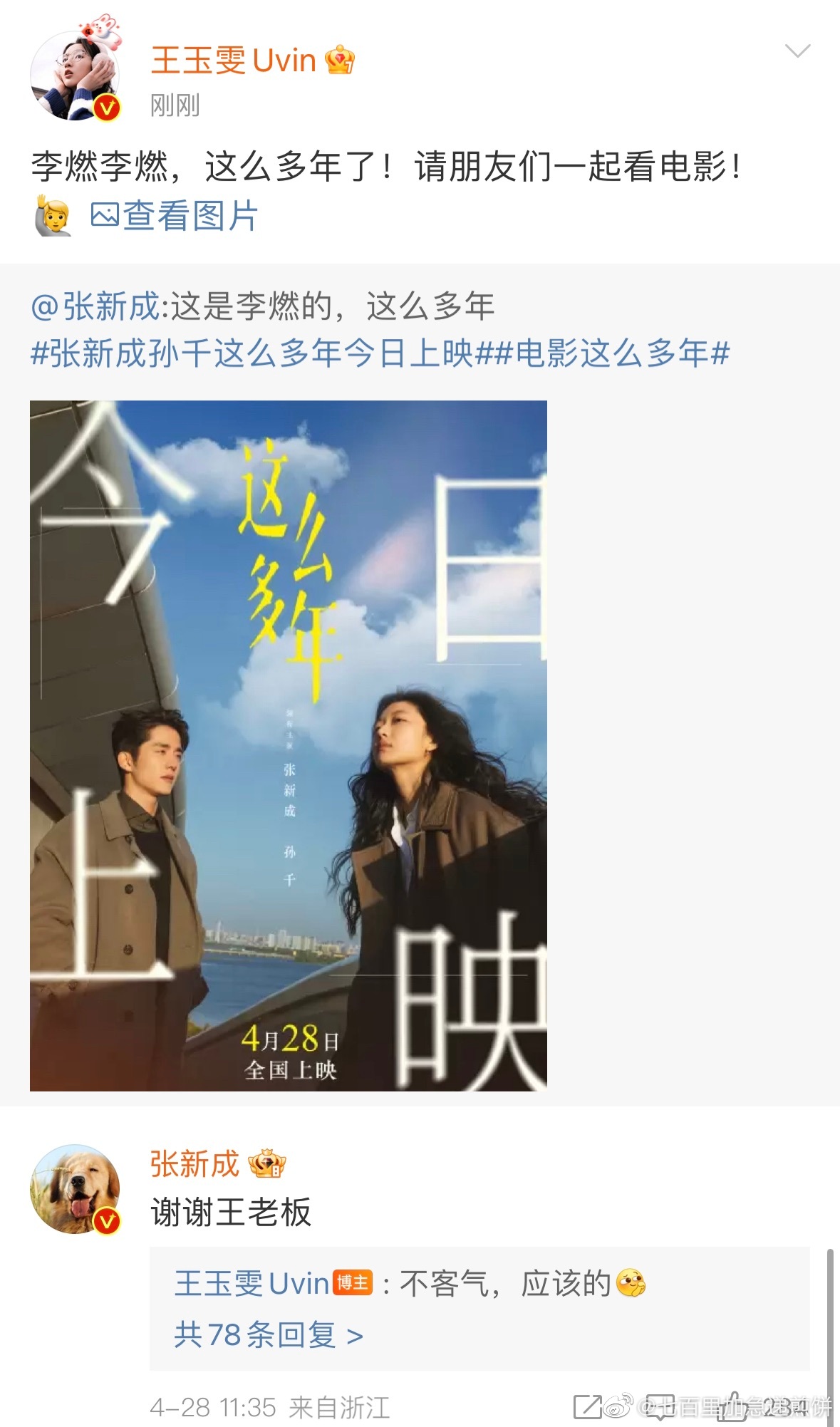 张新成王玉雯认识这么多年了啊!给对方的新作品宣传打call,一些帅哥美女梦幻联动~