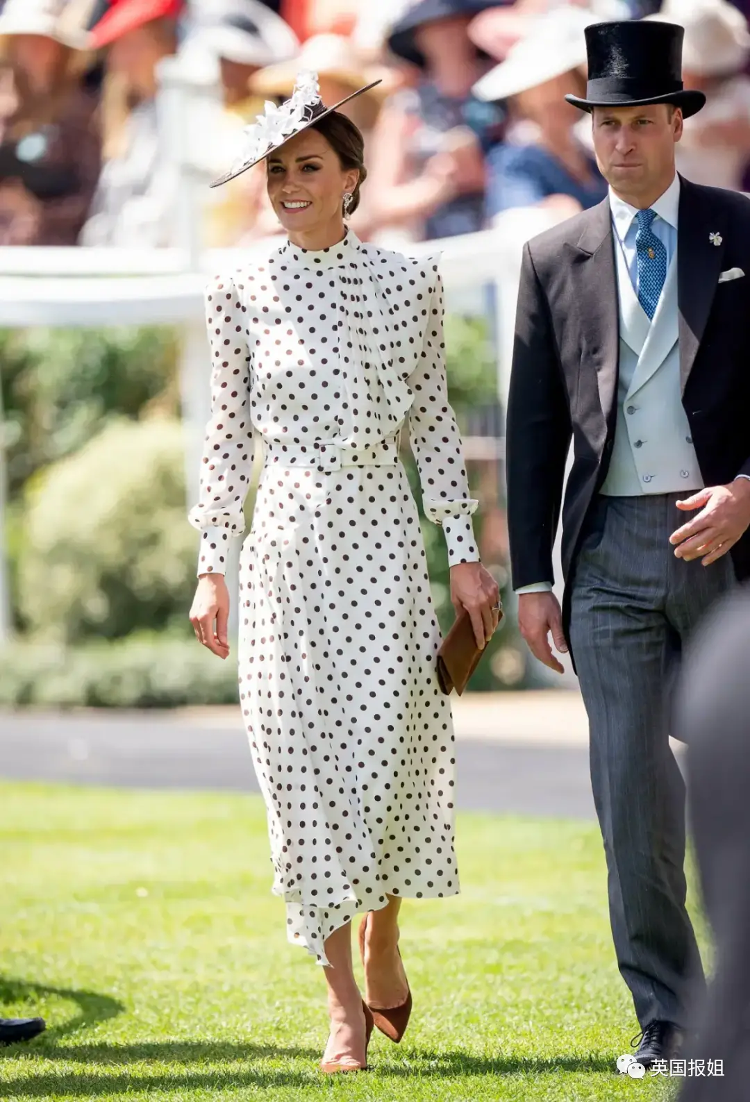 2022年赛马会上凯特的波点穿搭收到的好评最多,这身衣服据说致敬了戴安娜王妃80年代的经典造型。