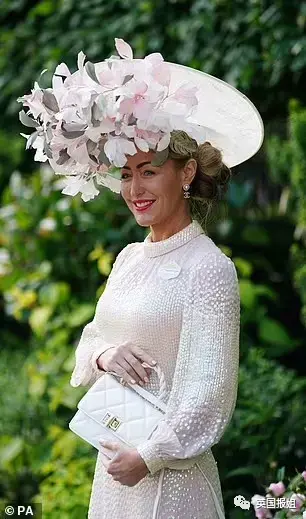 再比如这个叫Daniel Lismore的男子,他没有穿西装入场,而是身穿麦昆的红色礼服裙,戴着印有英国国旗的羽毛帽,造型相当华丽。 如果他能和一身红的凯特同框,那就太有意思了。 其实,当天还有很多一眼就让人记住的穿搭,是完全不知名的素人们贡献的。这位穿着灰色格纹连衣裙的女士,简直像从画中走出来的一样。 纯白色是许多美女观众的爱,可惜当天英国的阳光有点太强烈了,所以把大家都拍得有点过曝。