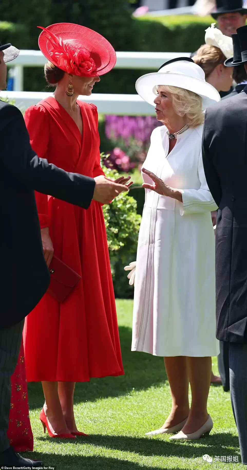每年赛马会都有大量王室核心成员盛装出席,已故的女王在世时,更是每一届都会参与。 毕竟女王本人爱马是出了名的,曾经在赛马会上自己赌的马跑赢了,赚了几块钱也能开心地和母亲炫耀。 以往女王都会在开幕式上坐着头一架马车登场,今年马车上的人换成了新加冕的国王查尔斯和王后卡米拉。 没有了女王身影的赛马会,难免会让人觉得有些没落和无聊。于是今年撑起王室门面的工作,就交到了凯特王妃的头上。 凯特在开幕式当天一进场,就吸引了所有人的眼球,用一个词形容凯特的穿搭,那就是“红红火火”。她穿着她最爱的亚历山大·麦昆设计的连衣裙,戴着被誉为“现代最伟大帽子设计师” Philip Treacy的平顶大沿礼帽登场。