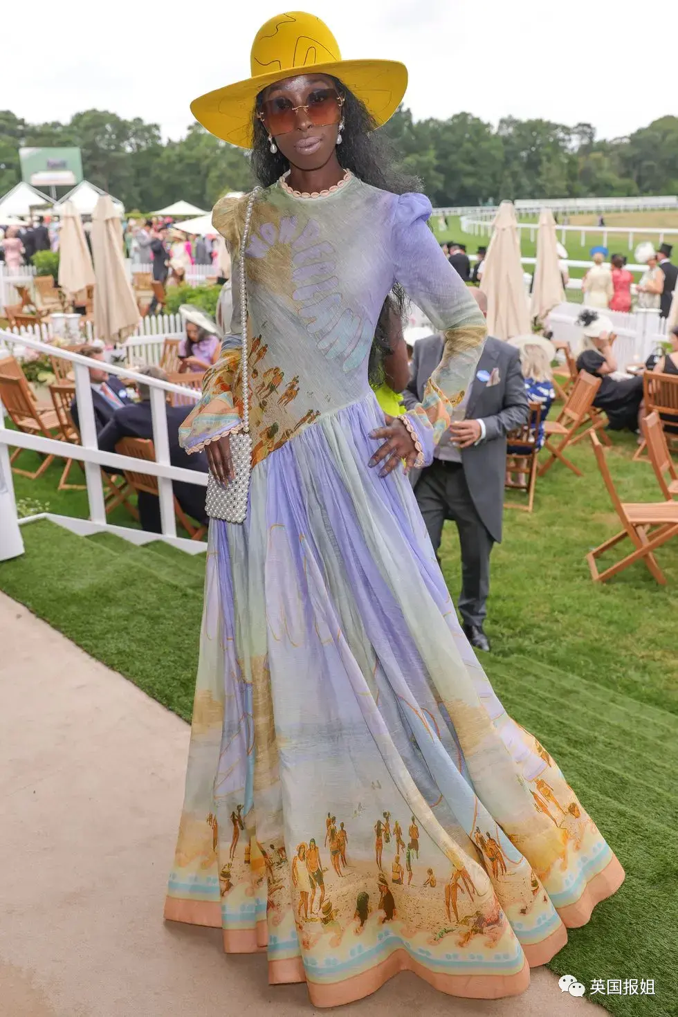 演员Nicholas Pinnock和模特Tia Rolph一起出席。Tia穿着灰色休闲西装和极简的米色头饰,和Nicholas的内搭保持了色系一致,这样的情侣装太高级了。 赛马会怎么能少了大花裙子?真人秀明星Georgia Toffolo的两套礼服都挺好看。第一套橙色连衣裙搭配的褶皱头饰显得脸好小。 第二套红白色连衣裙气质更加甜美,模仿著名女性艺术家弗里达造型的包包也太可爱了。 英国主持人Louise Roe穿了一件橙蓝色碎花裙,荷叶边的袖子尽显甜美,同样印着花花的平顶礼帽,凸显了活泼可爱的气质。 每年赛马会都有穿着很夸张的人,比如今年这位把向日葵顶在头上,还贴心做了蜜蜂配饰的女士。 还有很多把花园戴在脑袋上的富太太。别看有些帽子看着有点怪,许多都来自著名设计师,甚至是独家定做的,价格不菲。