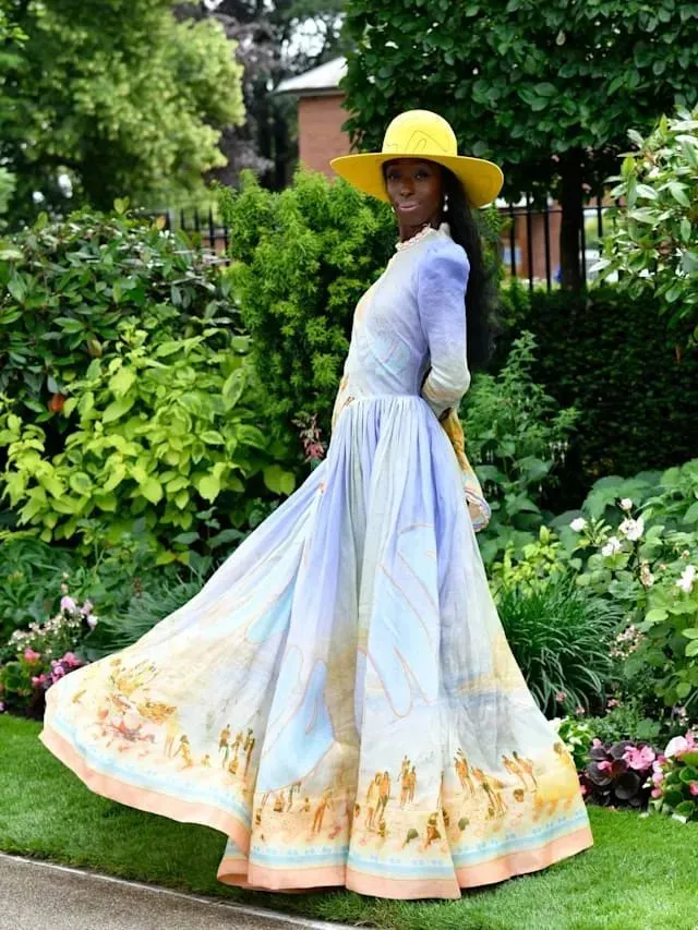 要是像模特Eunice Olumide这样艺高人胆大,还可以穿出异域度假风,渐变印花裙来自Zimmermann,搭配明黄色帽子,色彩之间的碰撞组合绝美。