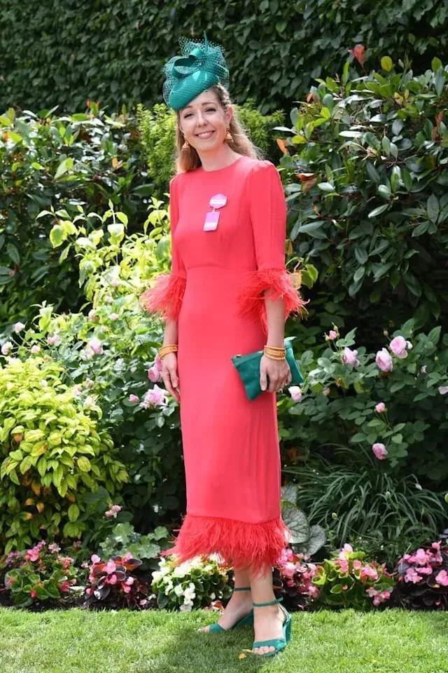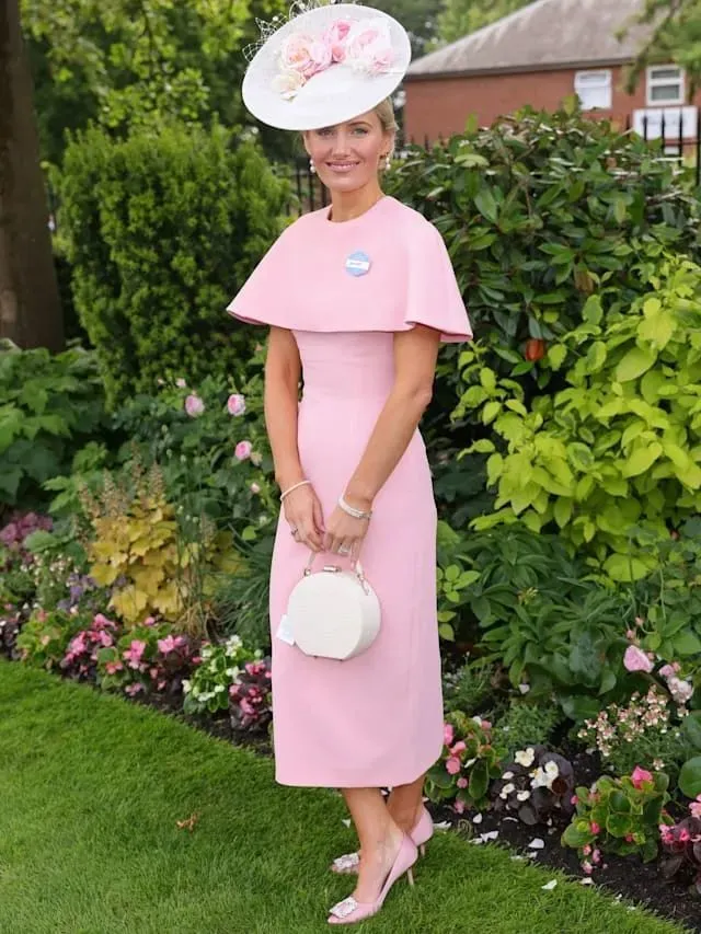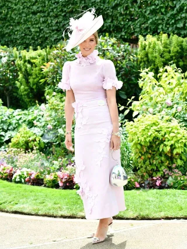 不止苏菲一个人这样穿,博主Laura-Ann Barr选了一条英国设计师品牌Emilia Wickstead的粉裙子,自带小斗篷优雅又可爱。脚踩Manolo Blahnik粉色高跟鞋,帽子也是粉粉的,包包是本土品牌Apsinal of London,很受英国王室和上流圈子女性喜欢。