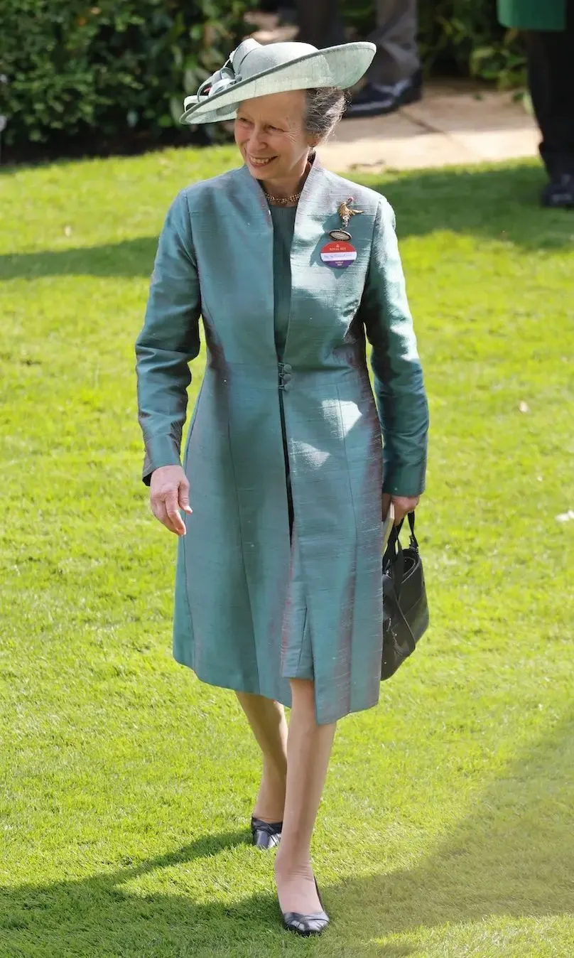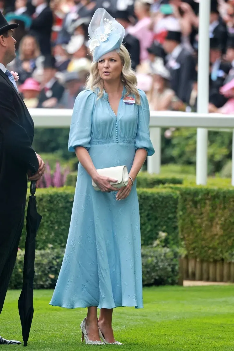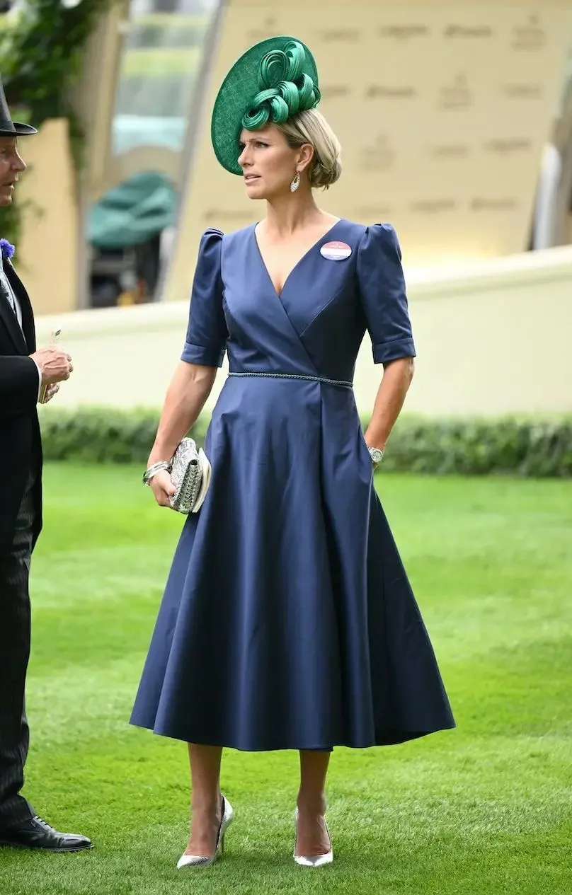 安妮公主的女儿Zara Tindall就蛮会玩撞色,用蓝色连衣裙搭配绿色帽子,鞋和包都是镜面银,不同色块组合在一起,既有呼应又有对比。