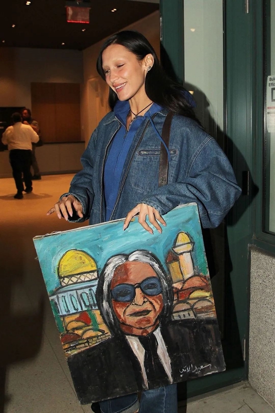 后来她拿到一幅爸爸Mohamed Hadid的画像,笑得好甜,是收到的礼物吧。