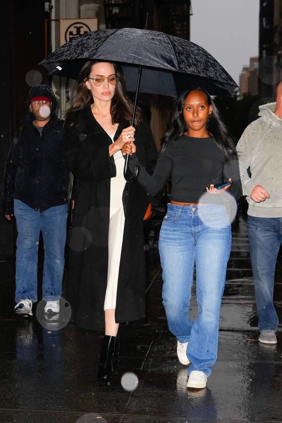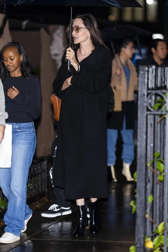 朱莉笑得真灿烂!雨下得淅淅沥沥的夜晚,女明星撑着伞迎着闪光灯走来,这氛围感拉满啦。虽然一身黑,但珍珠耳环和项链都是加分细节哦。