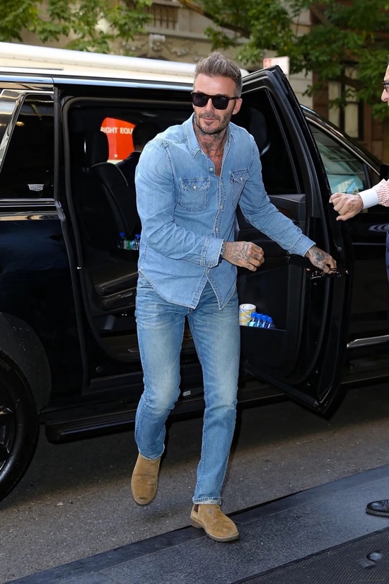 小贝和贝嫂穿情侣装咯!贝嫂的蓝色丝质长裙有一种舒缓感,搭配银色网眼靴,在闪光灯下看起来好时髦的说;至于碧咸,乖乖跟老婆顺色就行~