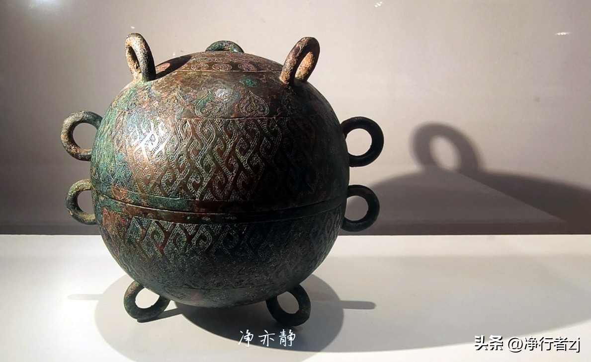 这尊春秋战国时期的青铜敦,器身呈球形,配有环耳,表面装饰几何纹,工艺精湛,体现了当时青铜铸造与纹饰设计的高超水平。