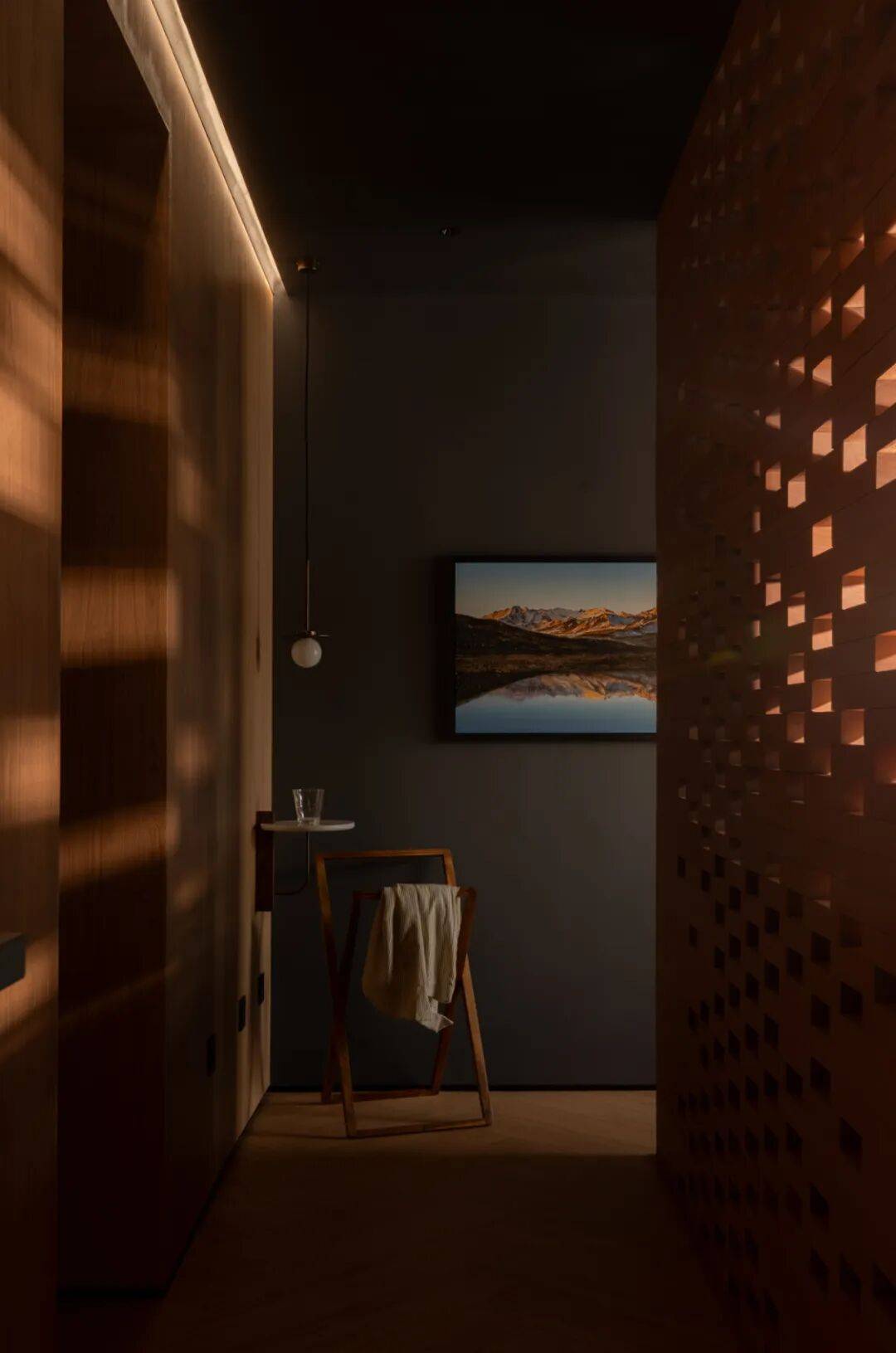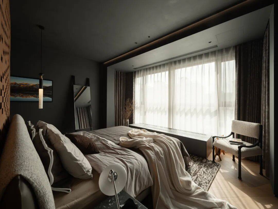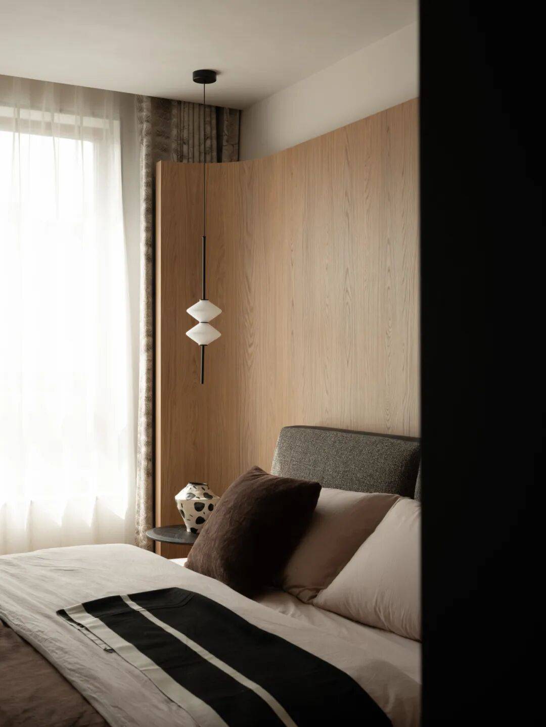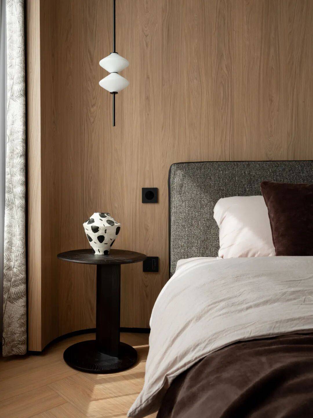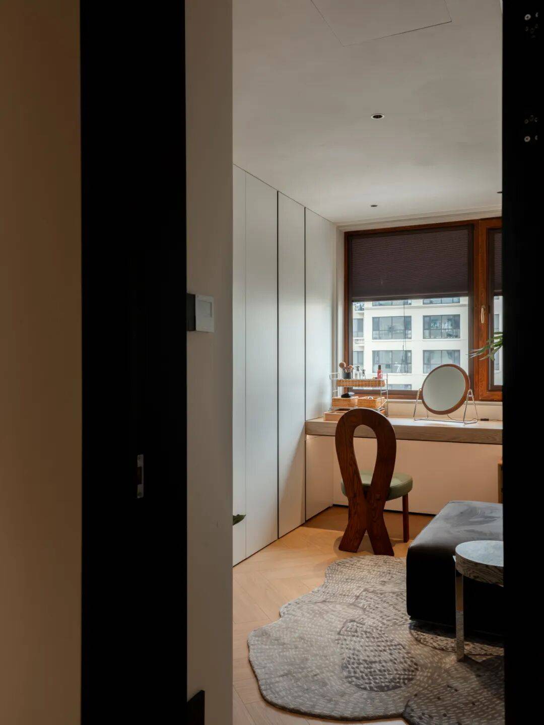 GuangHe Design ©摄影: 图派视觉 卧室|香袅细烟,人和花月眠 卧室作为居住者专属的私密领域,静谧而安宁。它与衣帽间、化妆间共同组成一个完整的功能模块,与公共区域完全分隔。 开启时,客区的声响轻缓漫入,如晨光至暮色般温柔陪伴;闭合时,一切纷扰被妥帖隔绝。情绪在日落时分缓缓升腾,又悄然沉淀于柔软的床榻、有序的衣帽间与窗边的梳妆角落。在此,每一个夜晚来临前的蓝调时刻,都是自我疗愈的静谧仪式。