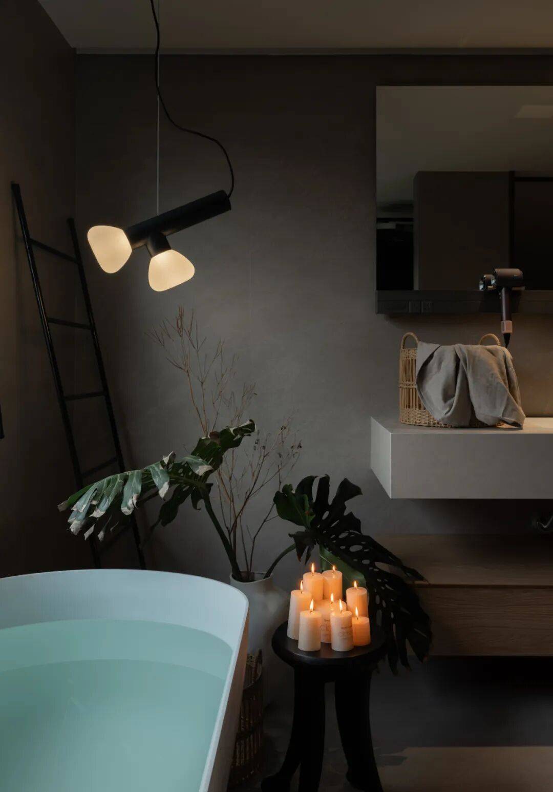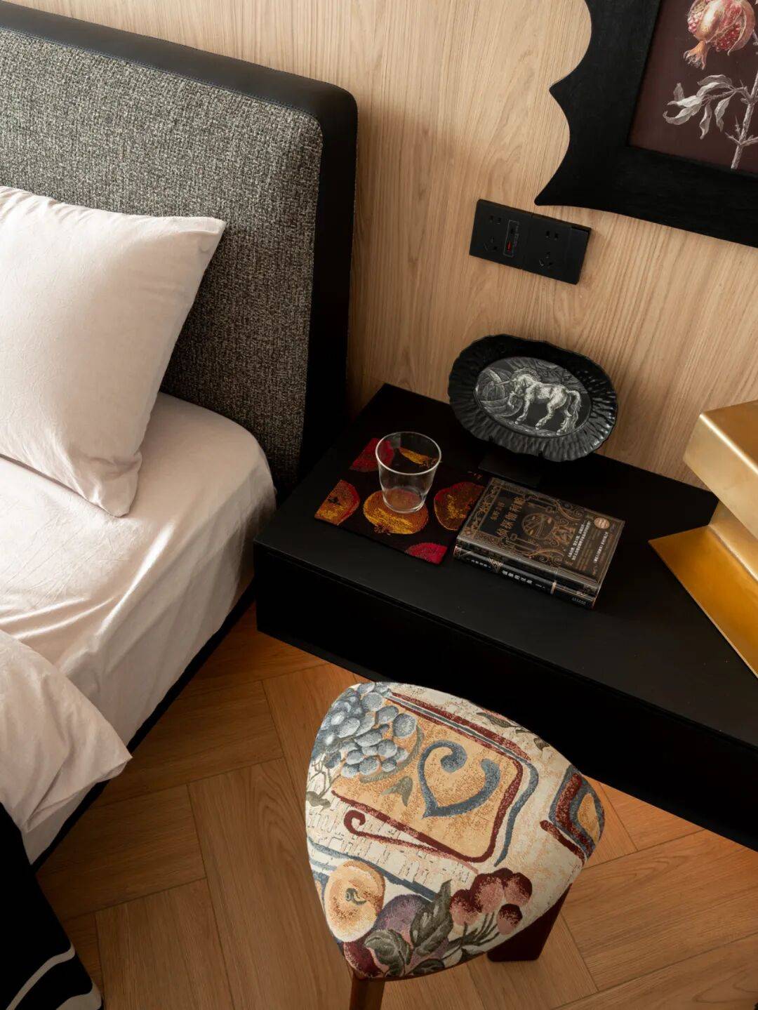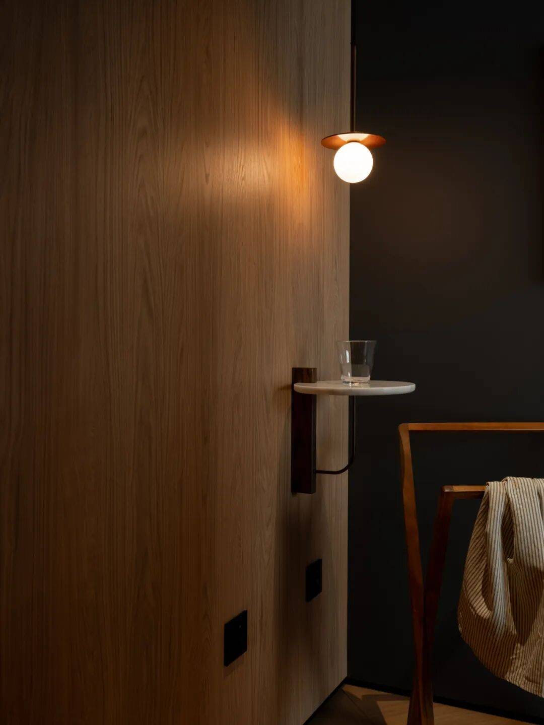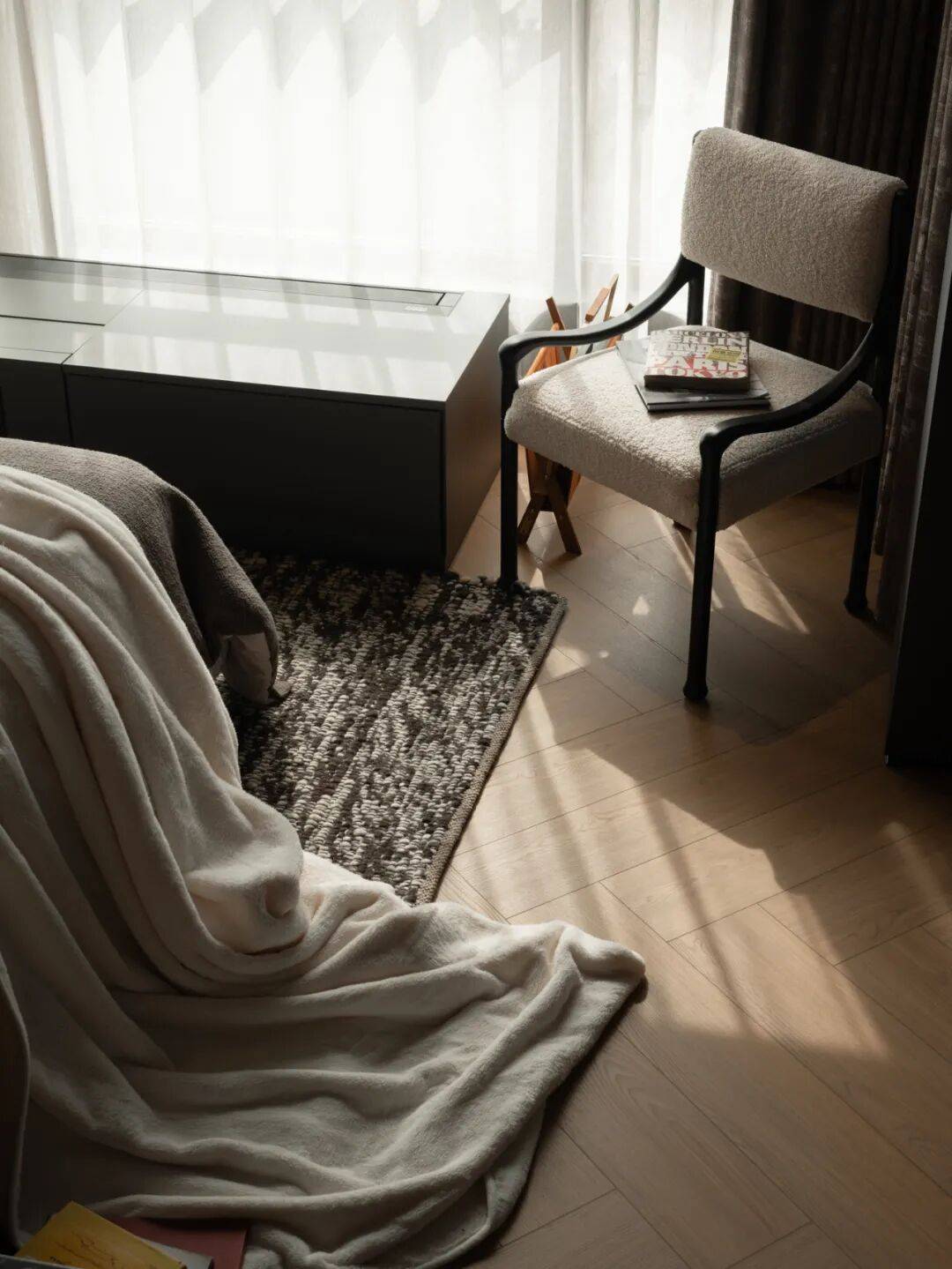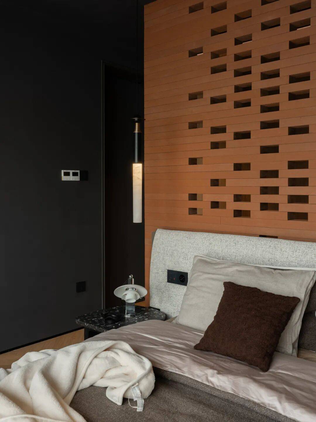 GuangHe Design ©摄影: 图派视觉 卧室|香袅细烟,人和花月眠 卧室作为居住者专属的私密领域,静谧而安宁。它与衣帽间、化妆间共同组成一个完整的功能模块,与公共区域完全分隔。 开启时,客区的声响轻缓漫入,如晨光至暮色般温柔陪伴;闭合时,一切纷扰被妥帖隔绝。情绪在日落时分缓缓升腾,又悄然沉淀于柔软的床榻、有序的衣帽间与窗边的梳妆角落。在此,每一个夜晚来临前的蓝调时刻,都是自我疗愈的静谧仪式。