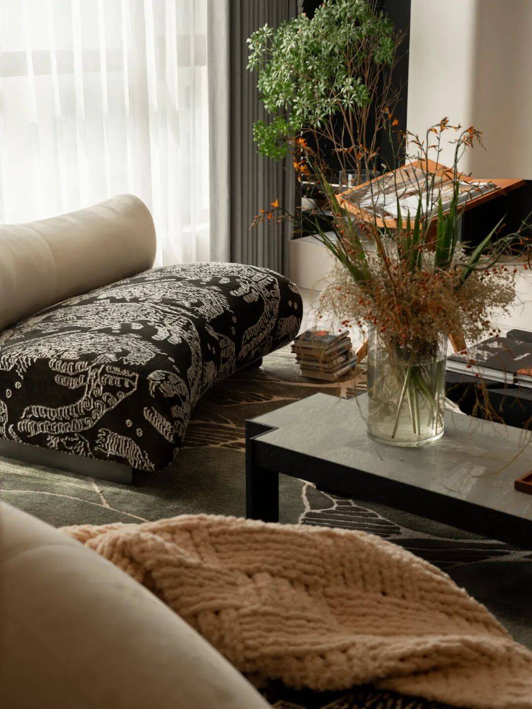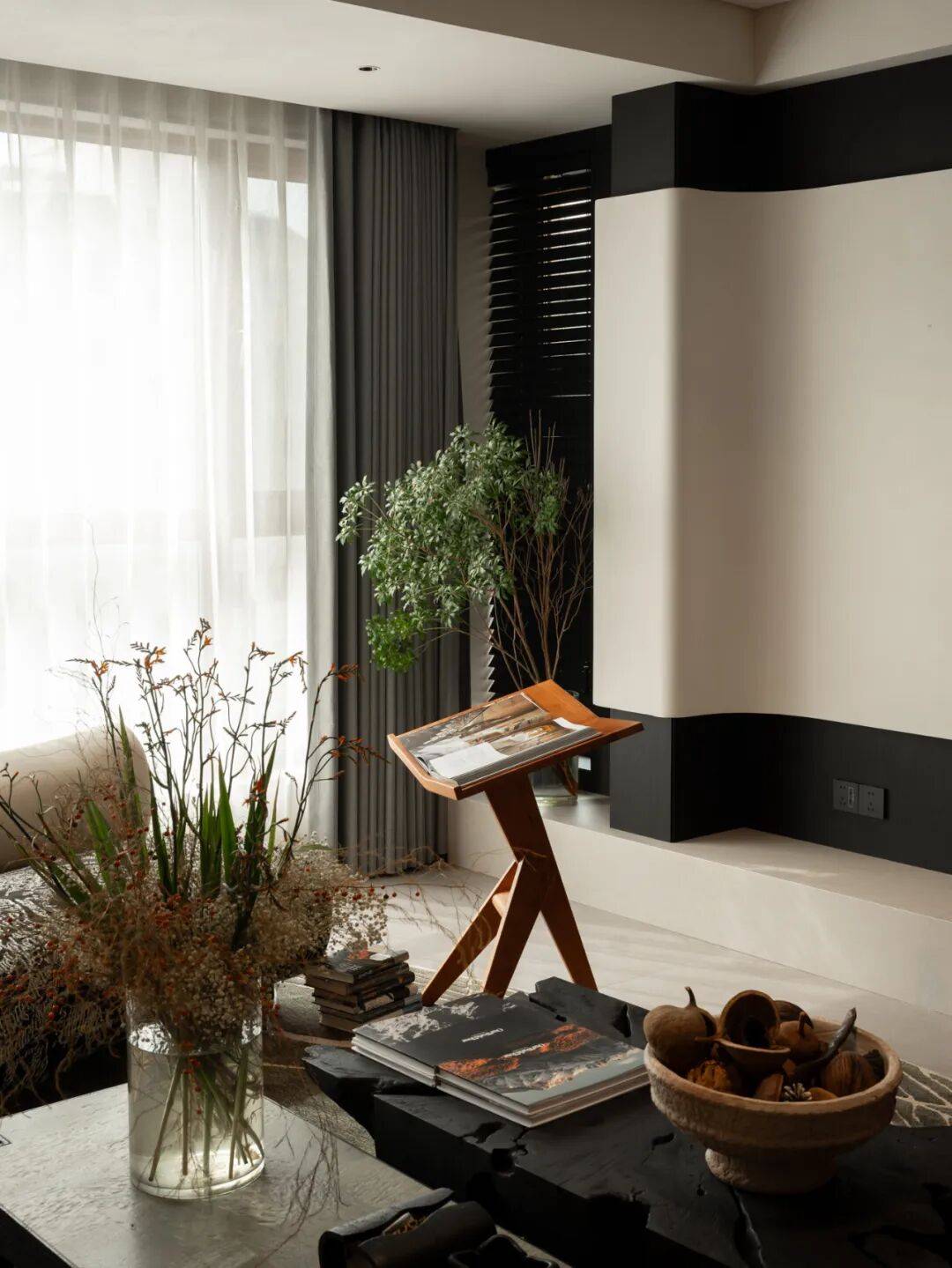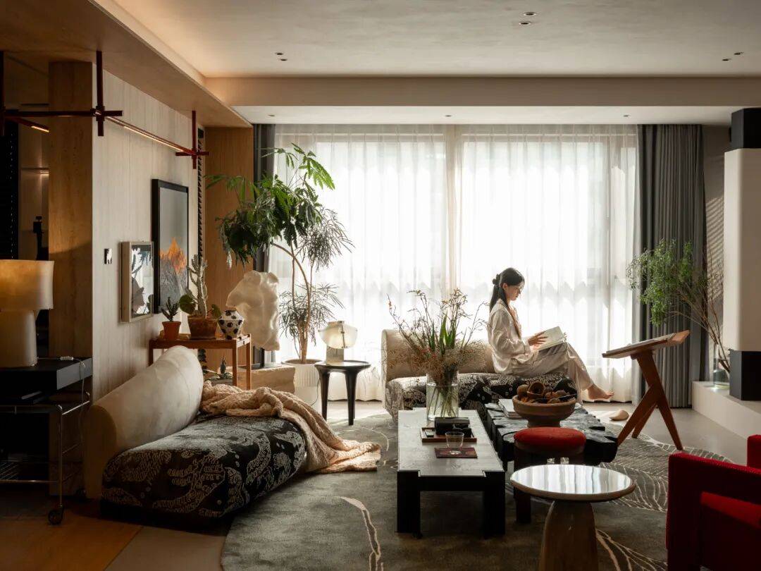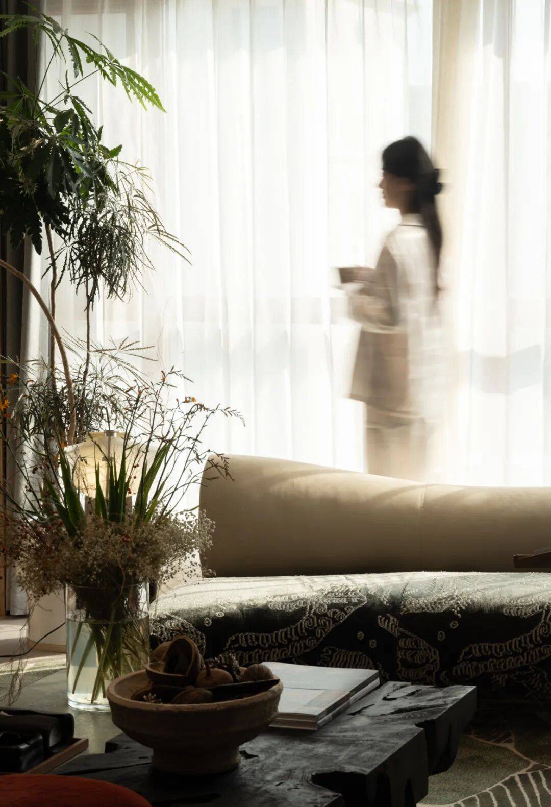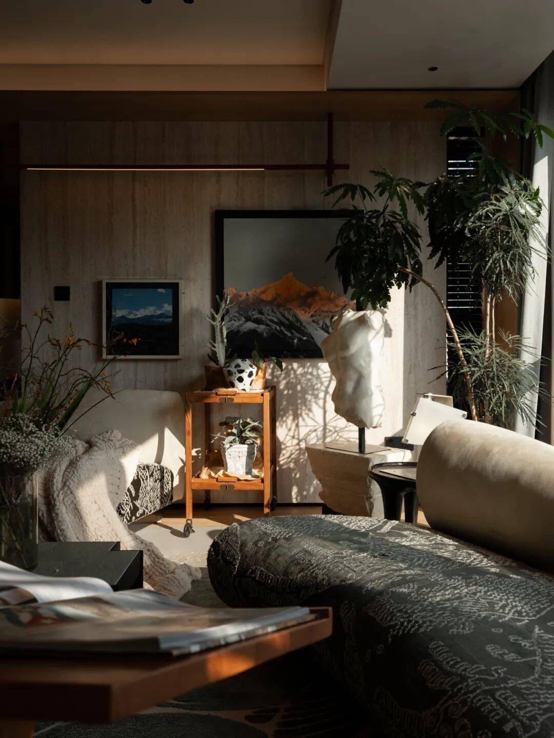 GuangHe Design ©摄影: 图派视觉 客厅|目之所及,皆是温暖 晨光漫过纱帘,轻落于木质壁纸之上,温厚的肌理在光中舒展。沙发以柔软的质感与细腻的纹理,成为空间温柔的锚点。一旁的龟背竹在光影间悄然苏醒,宽展的叶片与墙上的挂画、几上的摆饰轻声对话,勾勒出日常中不动声色的诗意。 当器物之美回归生活,最动人的风景,原来始终在身边。