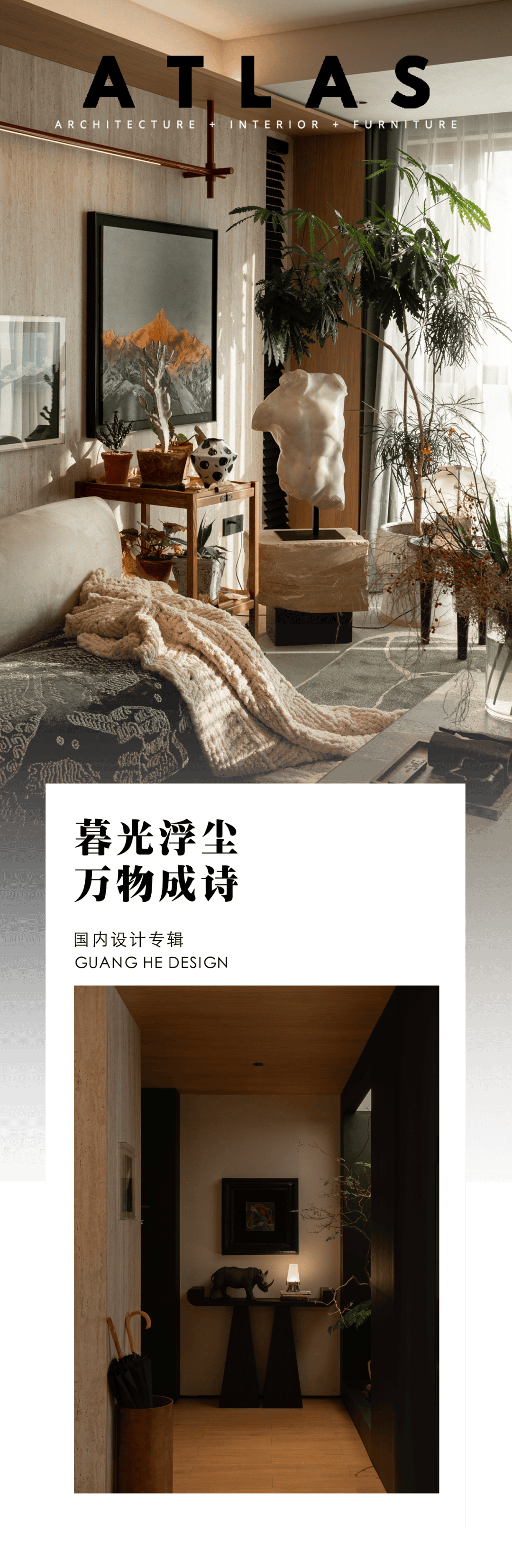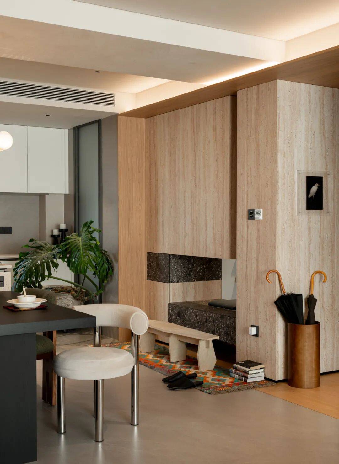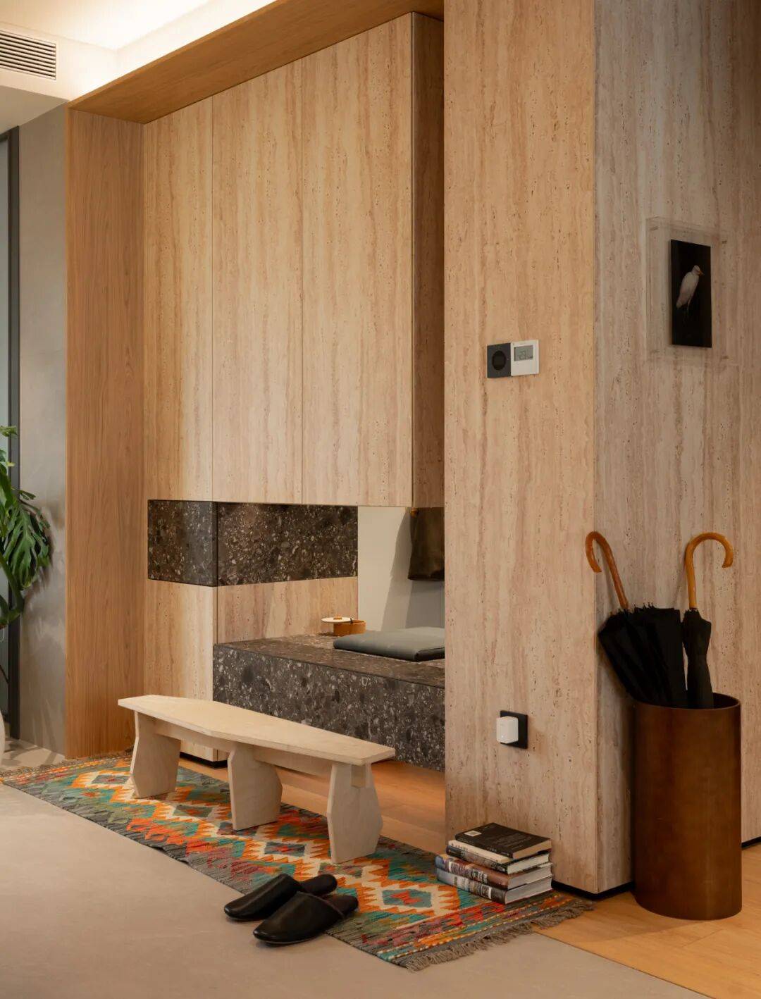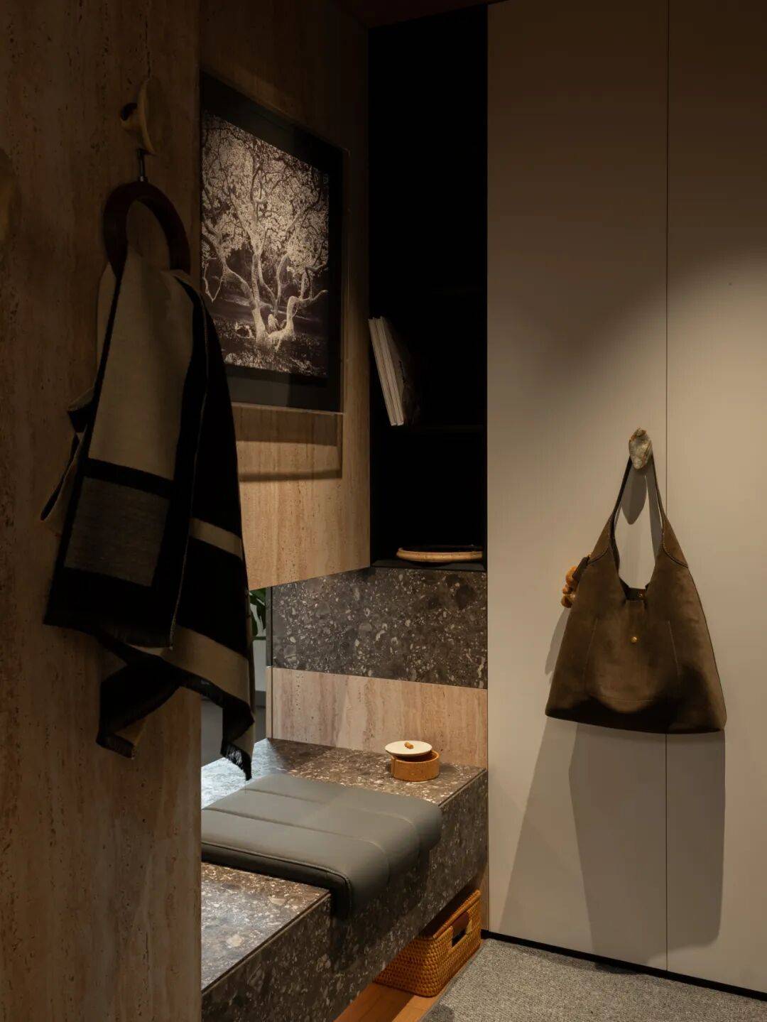 平面布置图 ©GuangHe Design 玄关|生活的序章,归家的仪式 玄关,不止是空间的过渡,更是心境的转换。它作为家的“阈界”,以低调而温厚的姿态,静默地完成由外至内的叙事转折。 一侧是整装待发的从容,木作系统与隐藏式收纳将功能隐于形式之后,勾勒出简净的立面;另一侧,或许是一方洞石端景,或是一盏微光壁灯,在有限尺度内营造出无限的意境。晨起离家,它是整理仪容、积蓄力量的起点;暮色归来,第一缕暖光、最熟悉的气息,在此悄然卸下世界的纷扰。 每一次推门而入的停顿,都是归心的仪式。光影在材质肌理上漫游,时间仿佛在此放缓。它不张扬,却以细致的关怀,承载钥匙轻响、行囊落地的日常片刻,让每一次出发与回归,