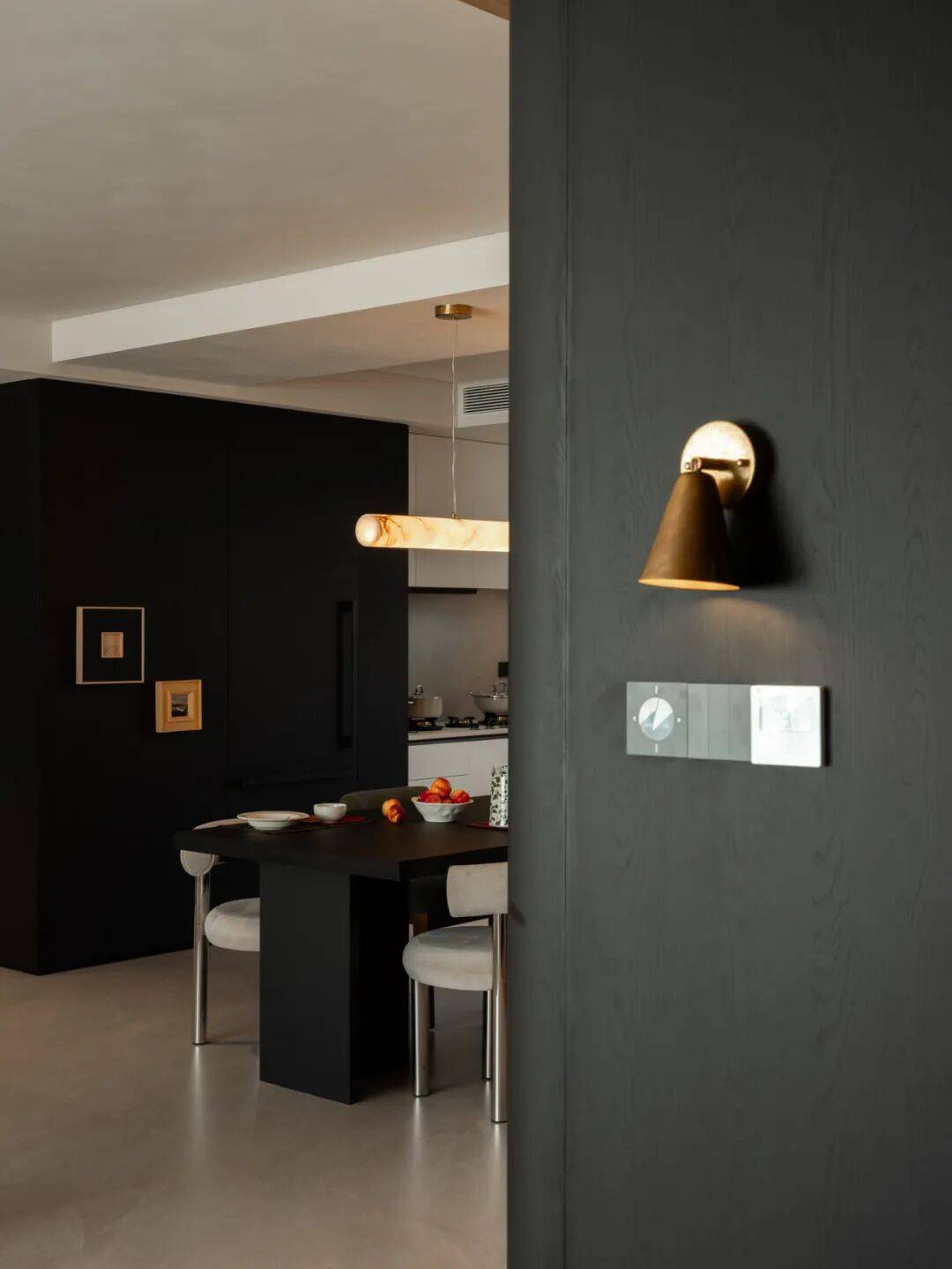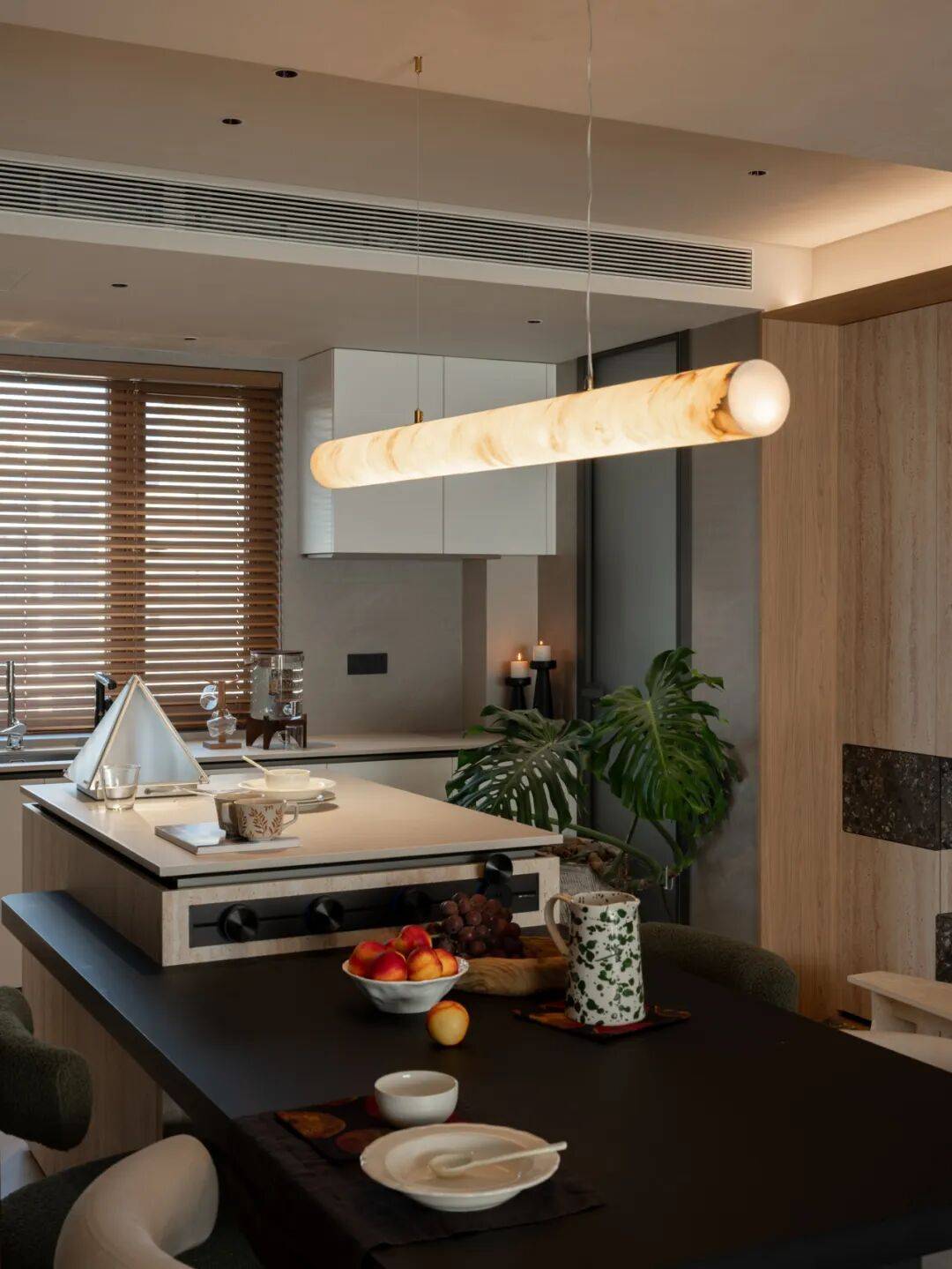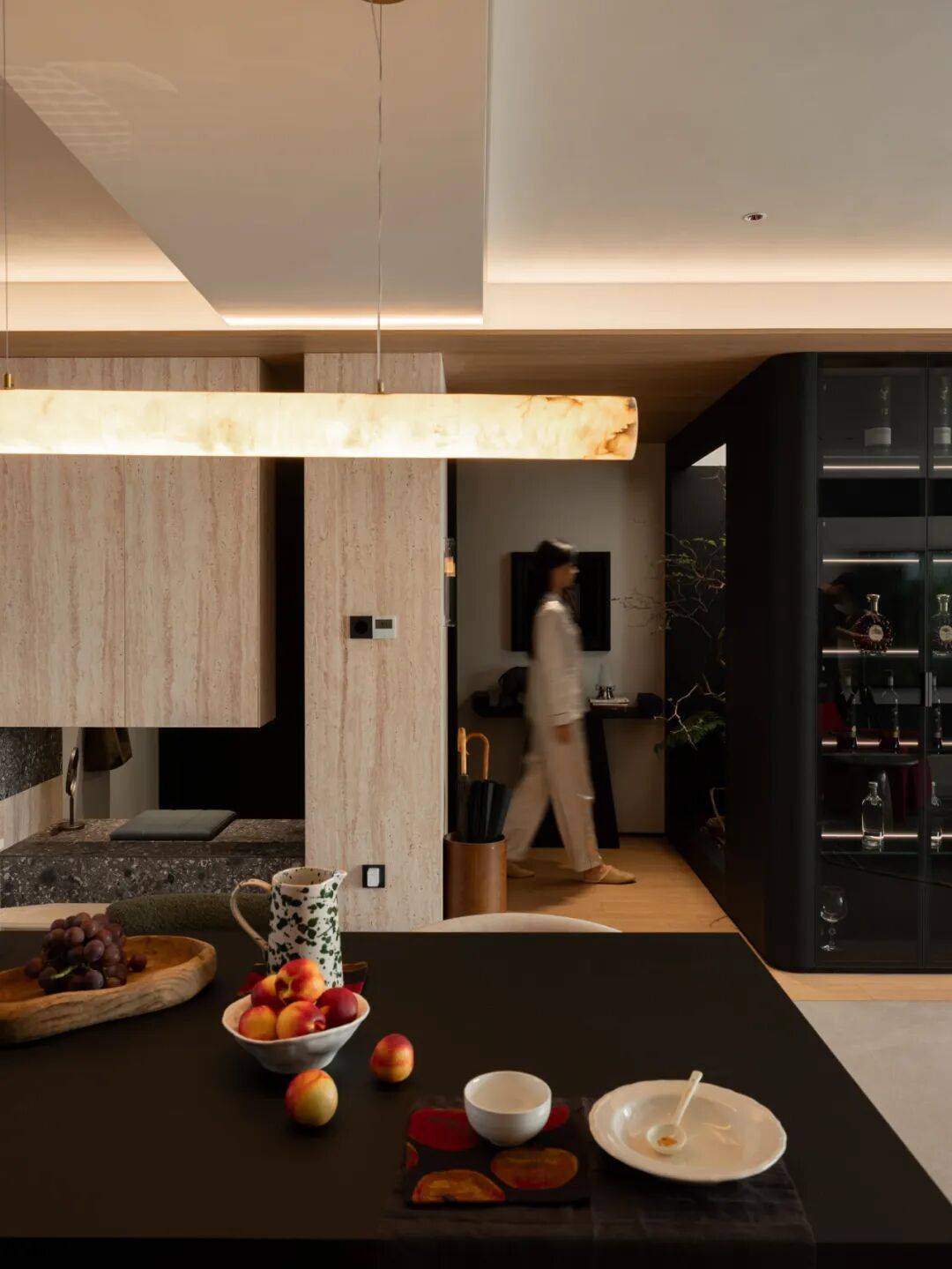 GuangHe Design ©摄影: 图派视觉 餐厅|人间至味,最是清欢 餐厅与厨房以全开放式布局融为一体,摒弃冗余隔断,仅以必要器物作为空间的点缀。功能与情感在此自由流动,烹饪与社交被巧妙纳入同一视觉序列,既保持了空间的开放通透,亦不失居家的包裹感。 白色岛台与哑光黑餐桌对比鲜明,又彼此呼应。周末午后,咖啡香气缭绕其间,掠过围坐谈笑的好友,漫向客厅中亲子嬉戏的窗前——生活的烟火与仪式,在此刻温柔交织。
