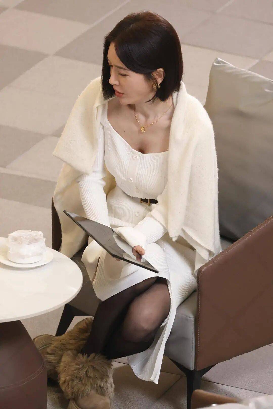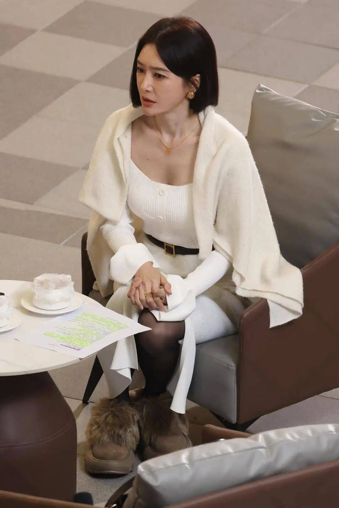 切换到工作场景,蔡少芬的穿搭立刻切换为 “专业模式”,在干练中藏着不动声色的精致。