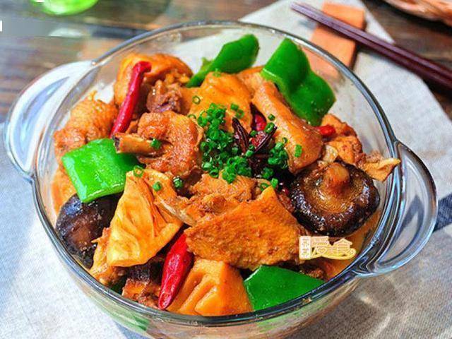 食材:鸡、香菇、竹笋、大蒜、干辣椒、姜、八角、冰糖、香醋、菜椒、盐、蚝油、生抽、黄酒、