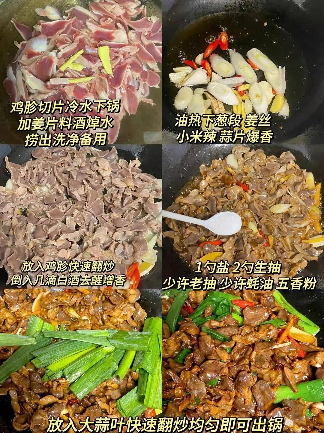旺火爆炒:大火翻炒鸡胗,烹料酒去腥,加生抽等调味翻炒均匀。