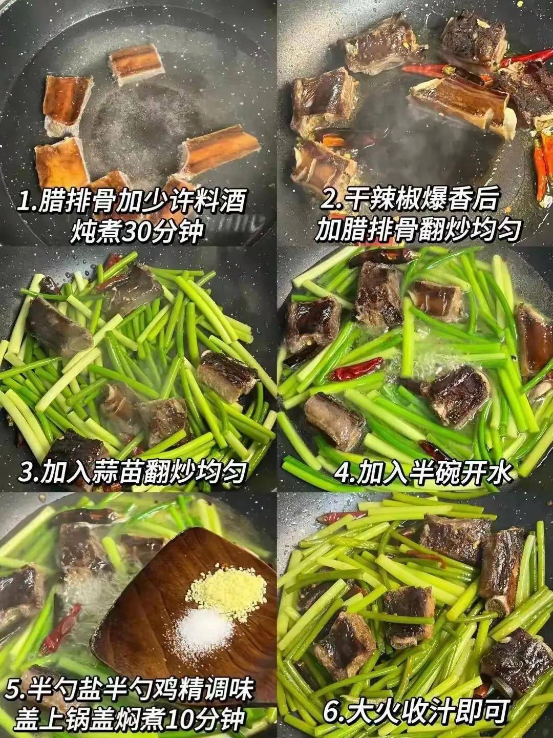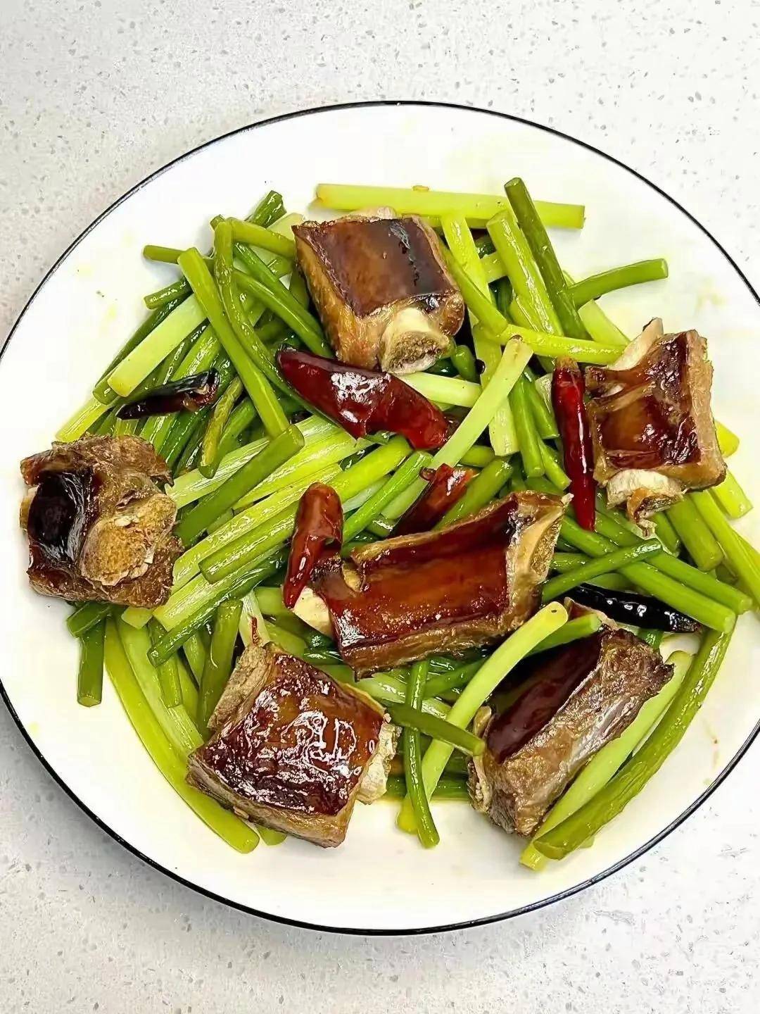 3. 腊排骨炒蒜苗(咸香下饭的经典搭配)