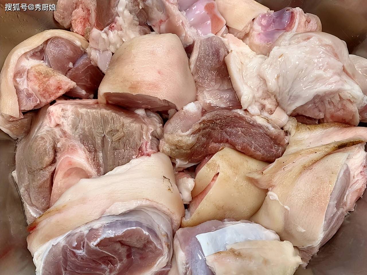 切割分块:将肘子顺着骨头切成大小均匀的块状(比麻将牌略大),方便入味和炖煮。